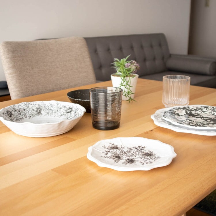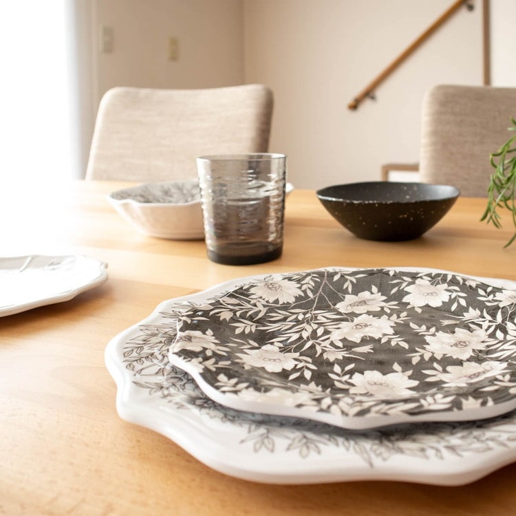 メラミンは軽くて割れにくく、手入れもしやすいのが特徴です。テーブルウェアコレクションでは、シンプルでスタイリッシュなものから、おしゃれな欧風デザイン、和食器テイストまでラインアップが豊富です。