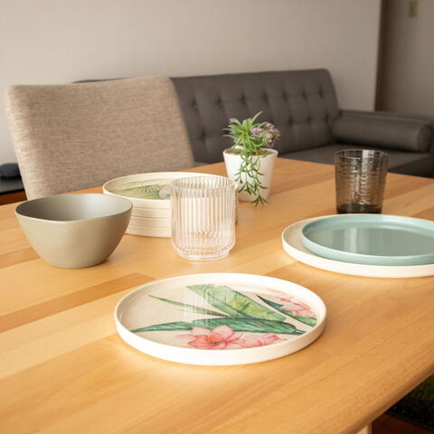メラミン食器は「メラミン樹脂」というプラスチックを素材とした食器です。食器の日常使いに非常に適しており、軽くて丈夫、割れにくくて汚れが落としやすいです。メラミンは熱いものを入れても熱伝導率が低いので、熱々の料理を入れても食器自体が熱くなりにくく、持ちやすいです。また、他のプラスチック樹脂よりも硬度が高いため、食器に傷がつきにくく長く使用いただけます。