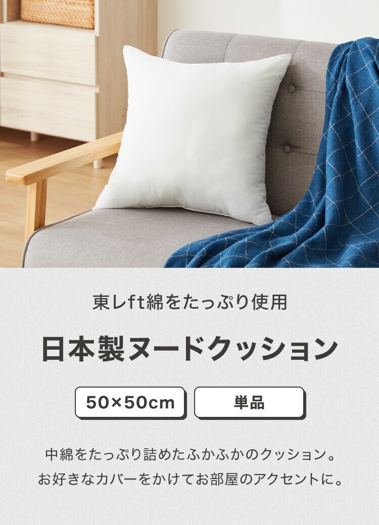 ヌードクッション 50×50cm 単品 東レ ft綿 圧縮梱包 コンパクト 日本製 国産 洗える 洗濯 手洗い ウォッシャブル インナー ポリエステル 背もたれ 1個 インテリア シンプル ベーシック 寝具 一個【送料無料】