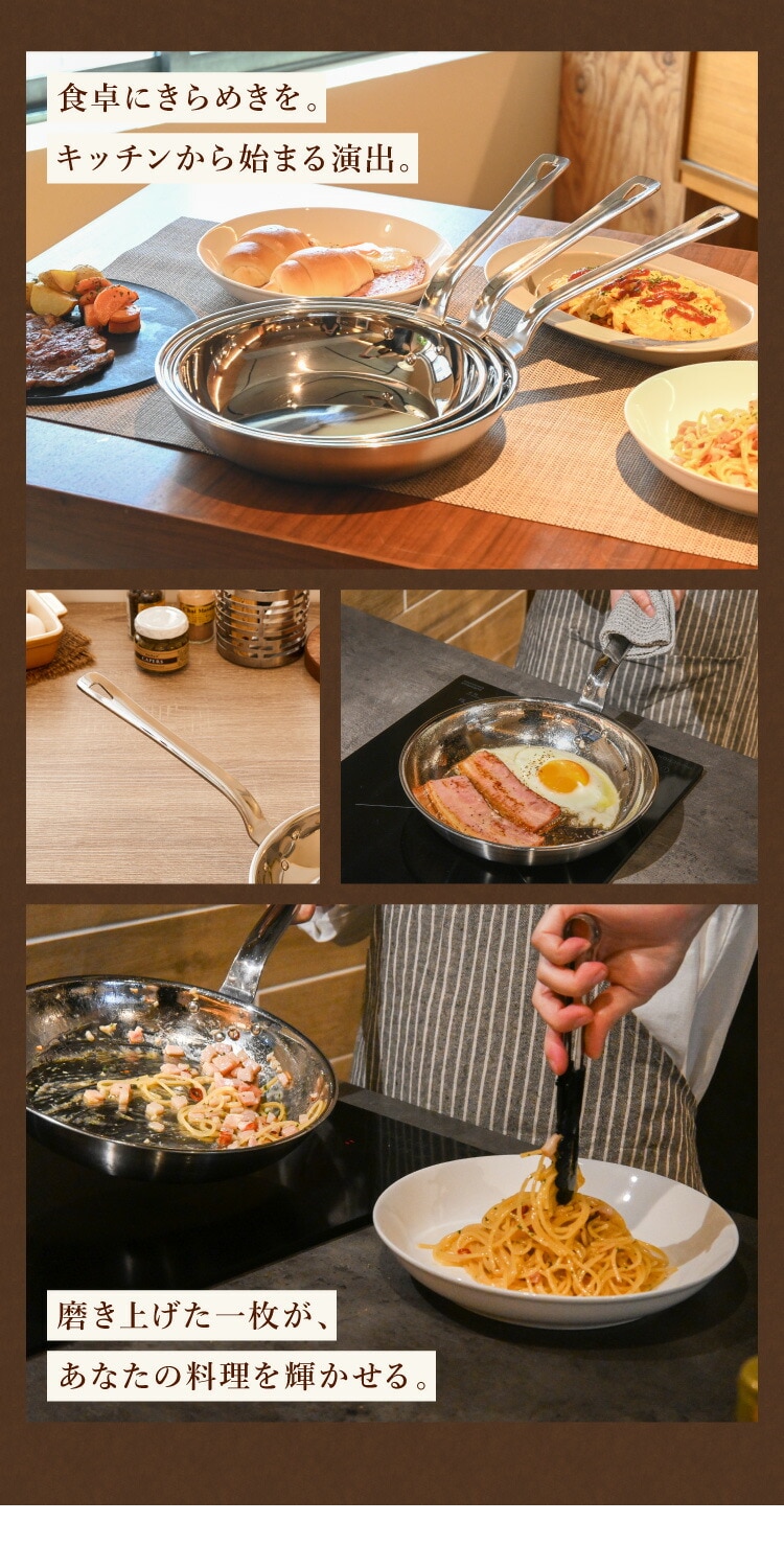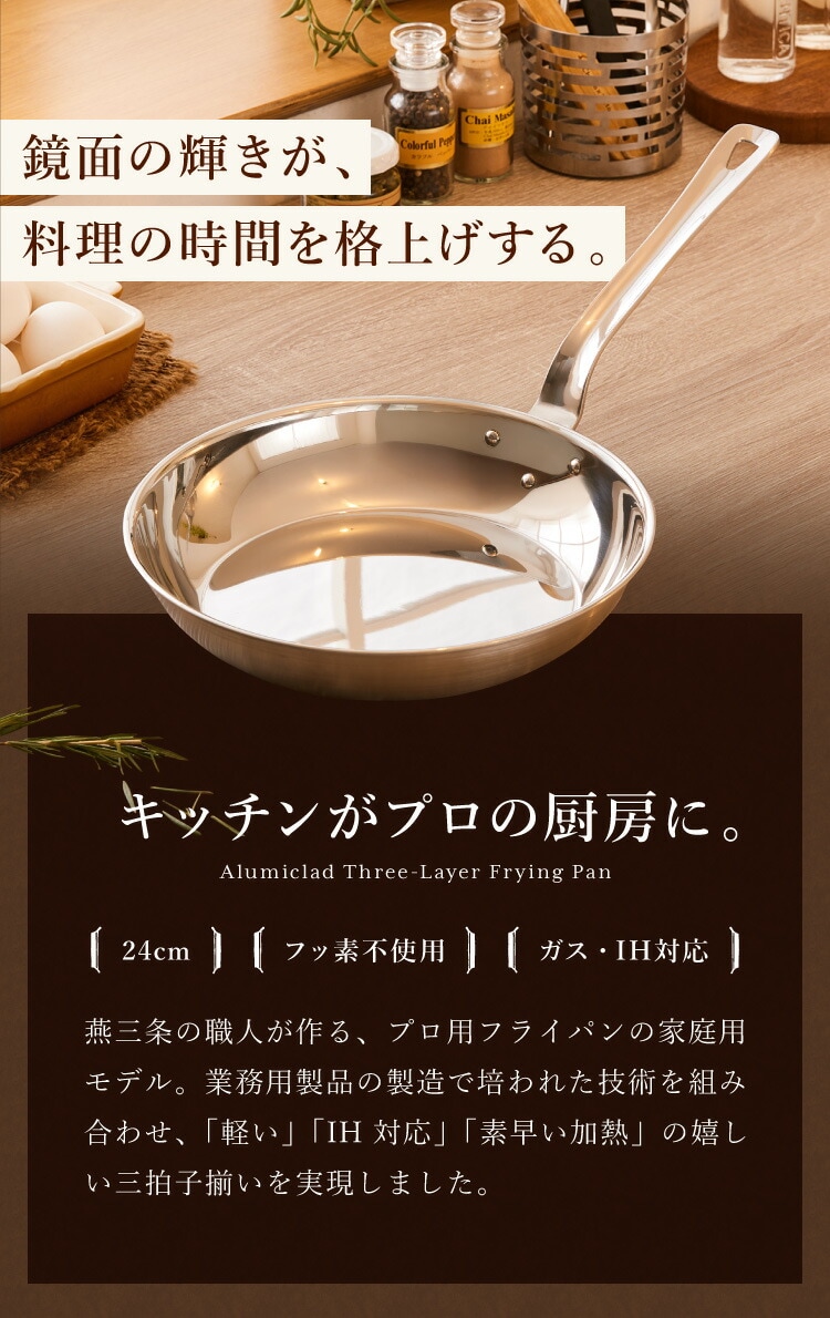 燕三条の職人が作る。プロ用フライパンの家庭用モデル。家のキッチンがプロの厨房に。