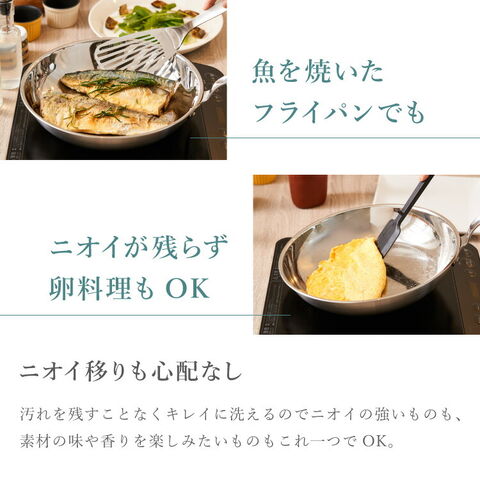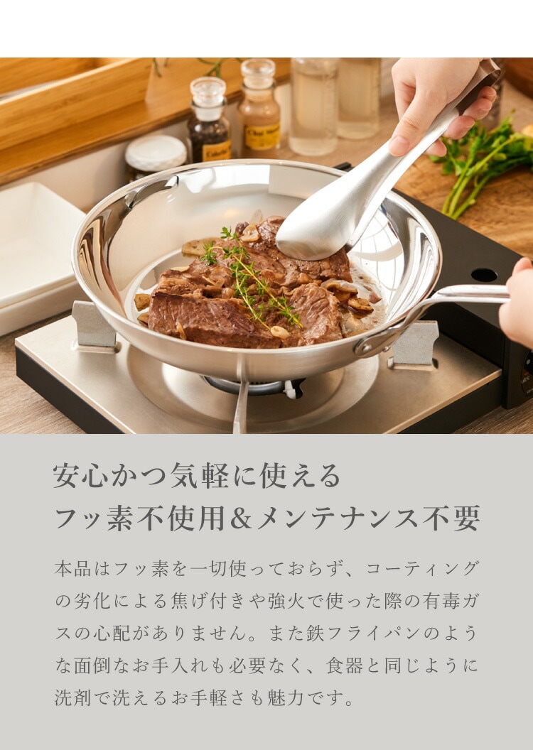 フッ素樹脂を一切使わないフライパンで、鉄フライパンのようなメンテナンスも不要です。
