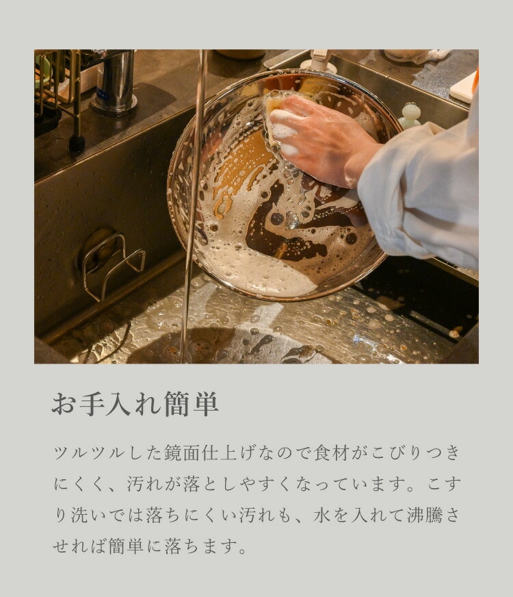 フライパン内面の仕上げをツルツルの鏡面(ミラー)仕上げにすることで食材がこびりつきにくくなり、汚れも落としやすくなりました。