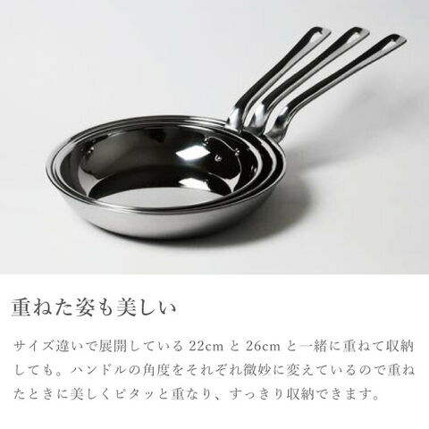 サイズ違いのフライパンを重ねた時の収まりも美しい設計です。