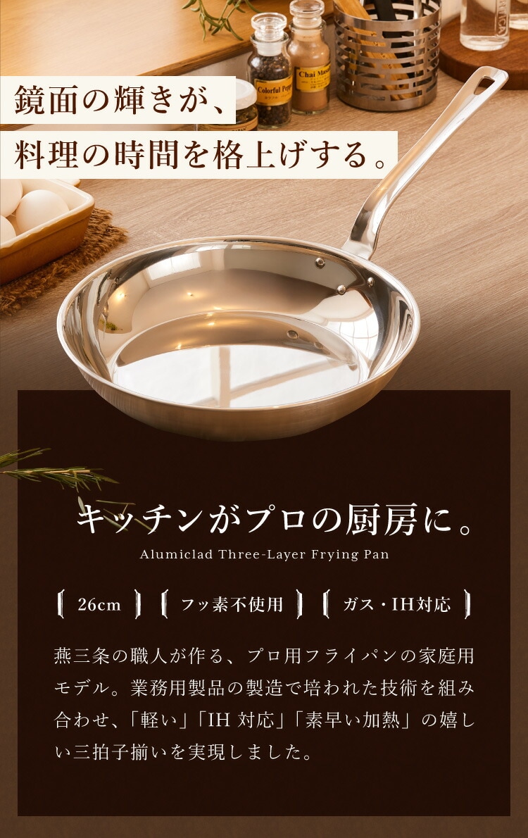 燕三条の職人が作る。プロ用フライパンの家庭用モデル。家のキッチンがプロの厨房に。