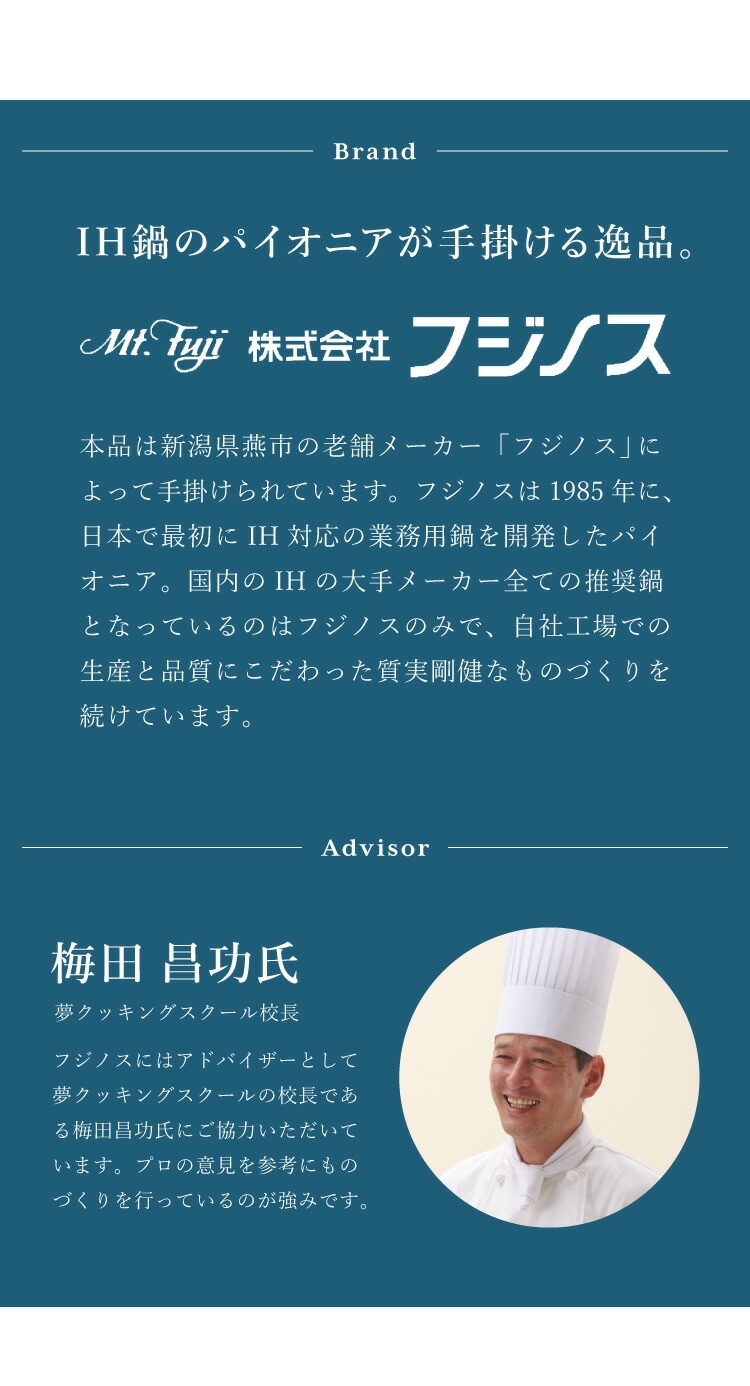国内のIHの大手メーカー全ての推奨鍋となっているのはフジノスのみで、自社工場での生産と品質にこだわった質実剛健なものづくりを続けています。