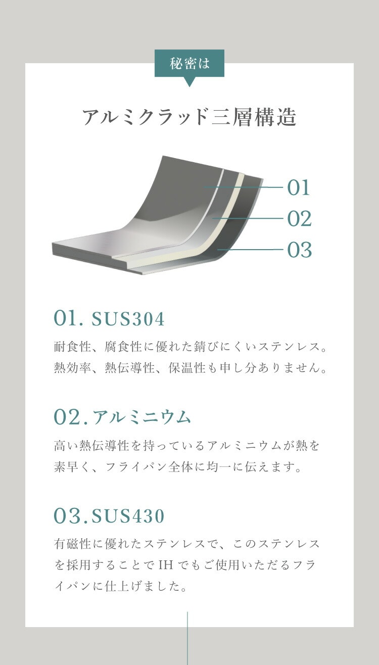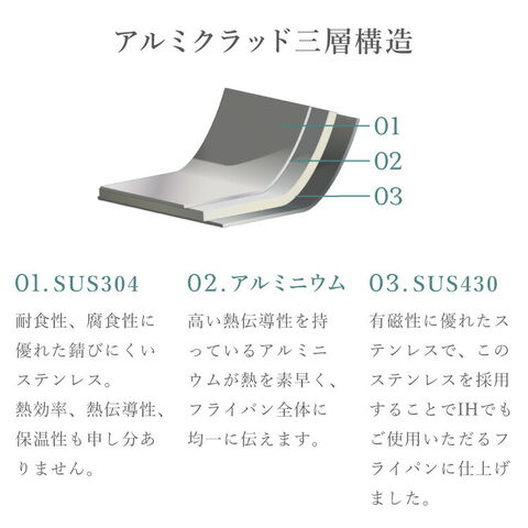 [2]発生した熱は内側のアルミ材が素早くフライパン全体に熱を効率的に伝えます。