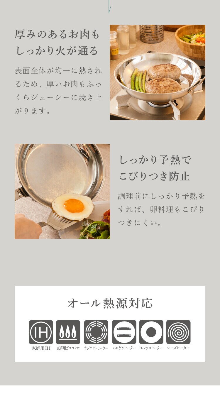 「アルミクラッド3層鋼」により、火の通りが均一でムラなく綺麗に焼き上げることができます。