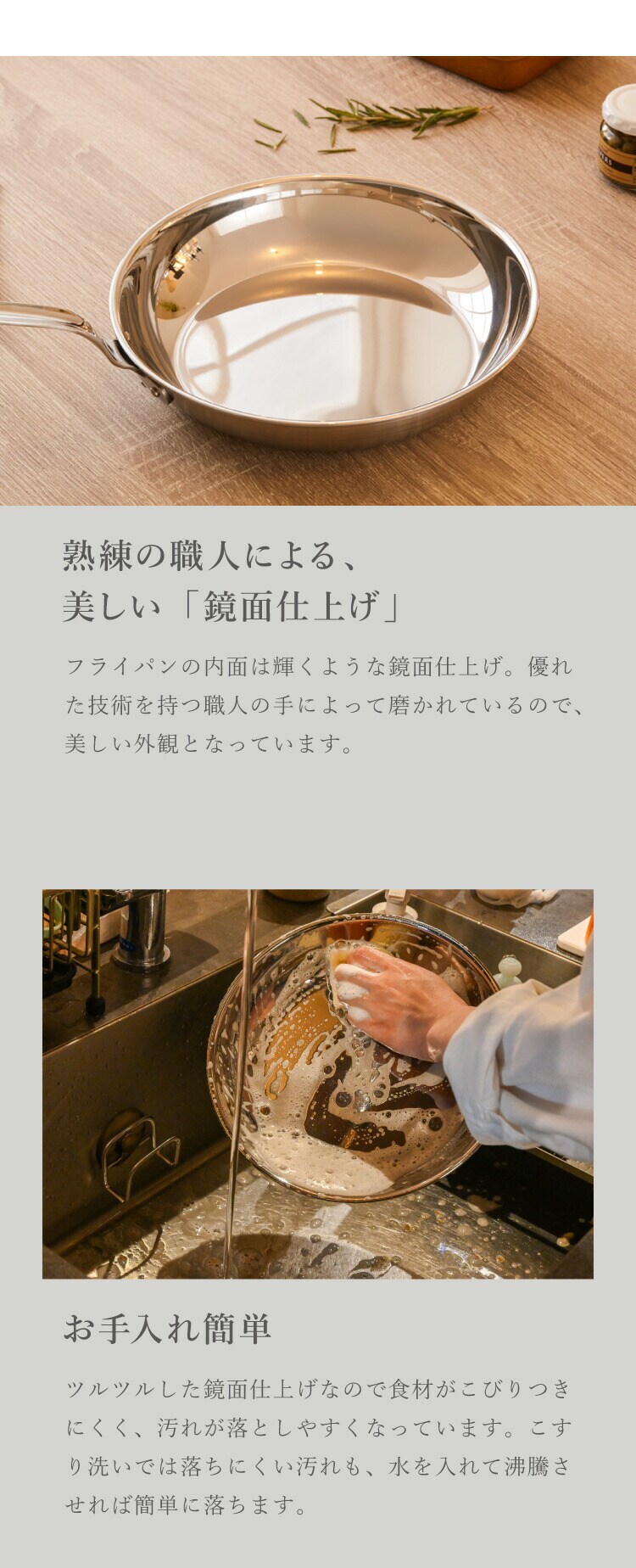 フライパン内面の仕上げをツルツルの鏡面(ミラー)仕上げにすることで食材がこびりつきにくくなり、汚れも落としやすくなりました。