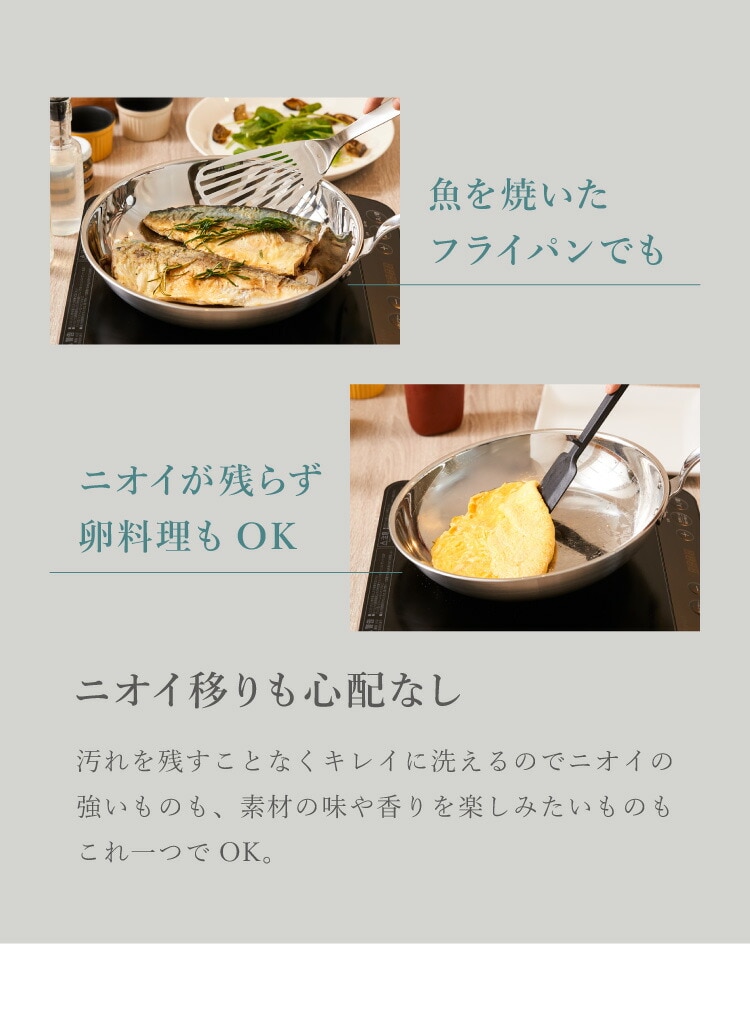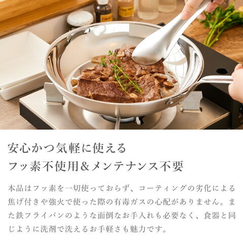 フッ素樹脂を一切使わないフライパンで、鉄フライパンのようなメンテナンスも不要です。