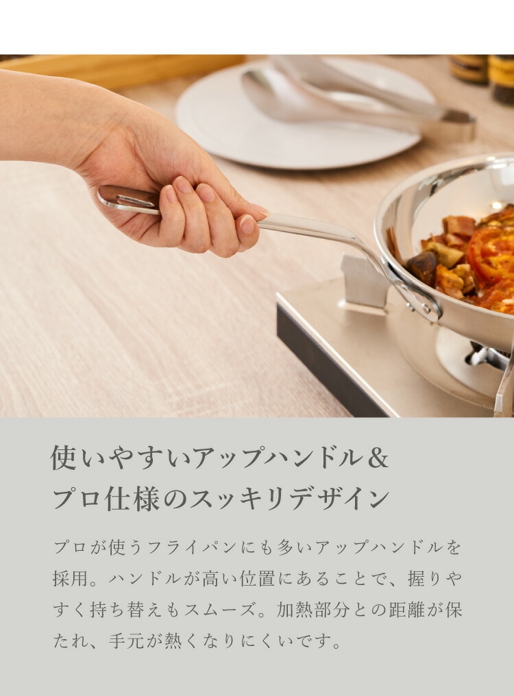 プロが使うフライパンにも多い「アップハンドル」を採用し、使いやすいハンドル角度に。