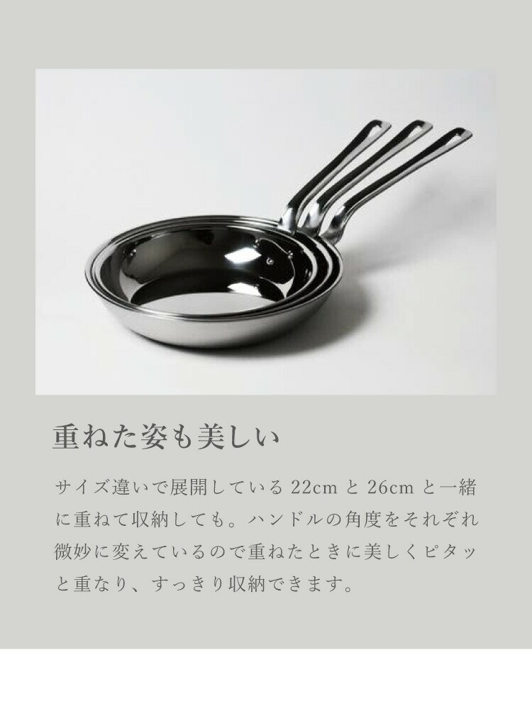 サイズ違いのフライパンを重ねた時の収まりも美しい設計です。