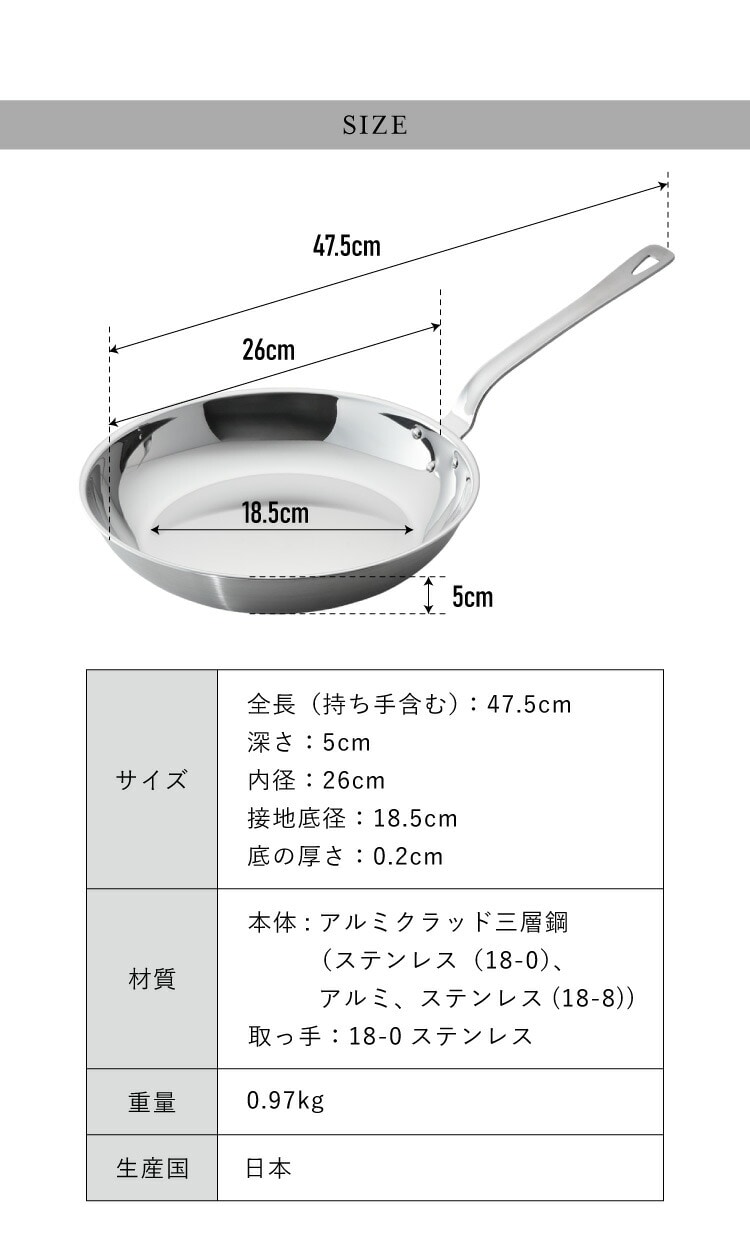 燕三条の職人が作る ステンレス3層フライパン 26cm 20年保証 日本製 ガス火・IH対応 アルミクラッド三層フライパン ステンレス製 フライパン フッ素不使用 フジノス【送料無料】