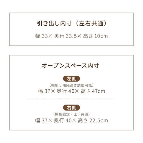 右側収納棚(高さ調整不可)×2:幅37×奥行40×高さ22.5cm