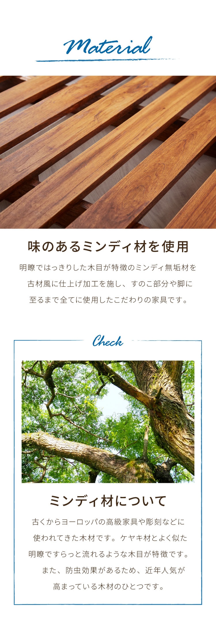 本体には、美しい木目と深みのある色合いが特徴のミンディ無垢材を使用。
