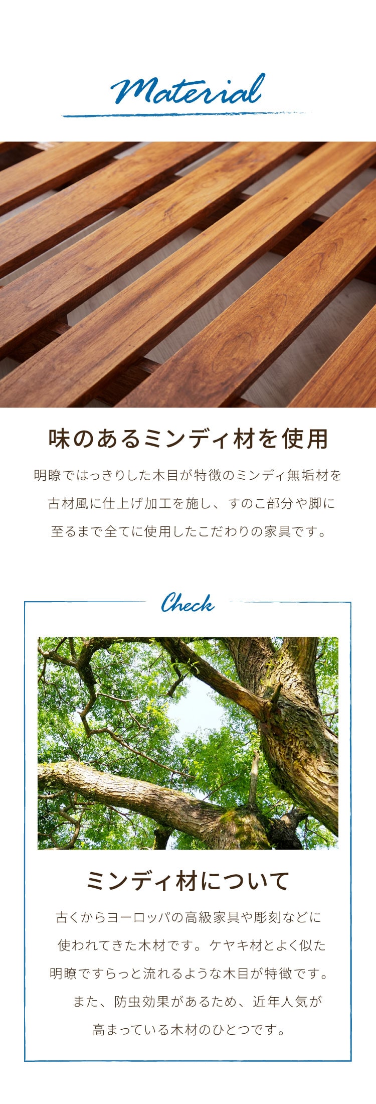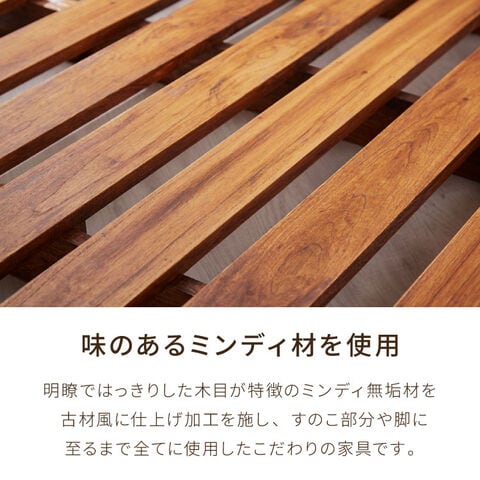 本体には、美しい木目と深みのある色合いが特徴のミンディ無垢材を使用。
