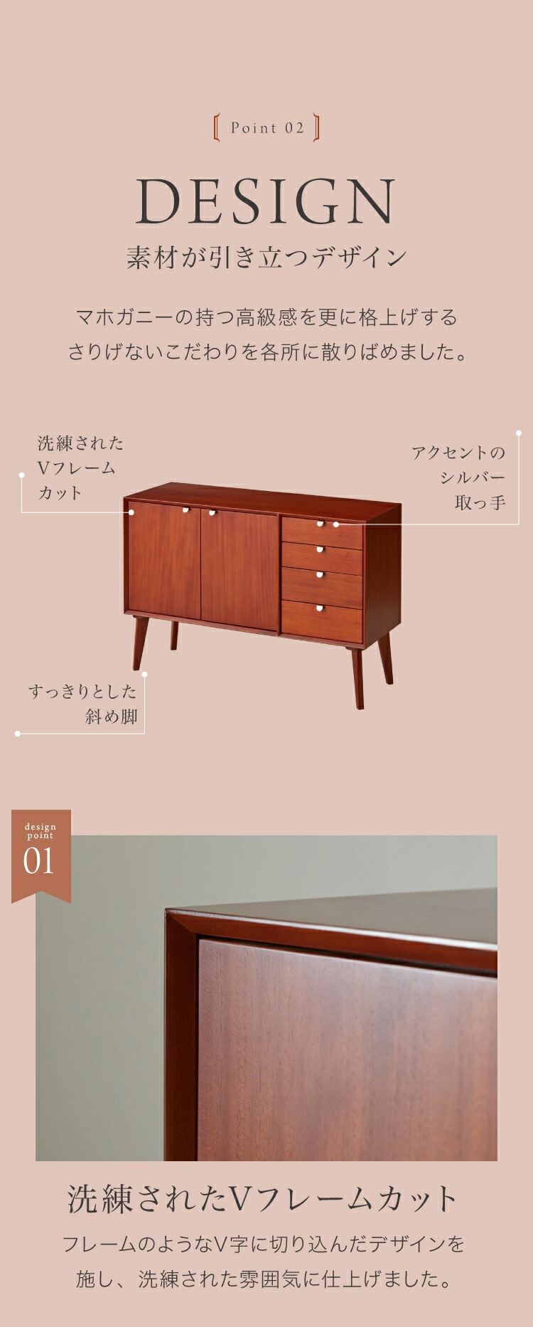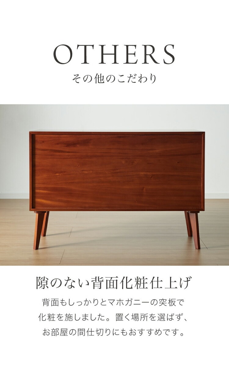そんなマホガニーの突板を背面や裏側に至るまでふんだんに使用した北欧ヴィンテージ風の高級感あふれるキャビネットです。