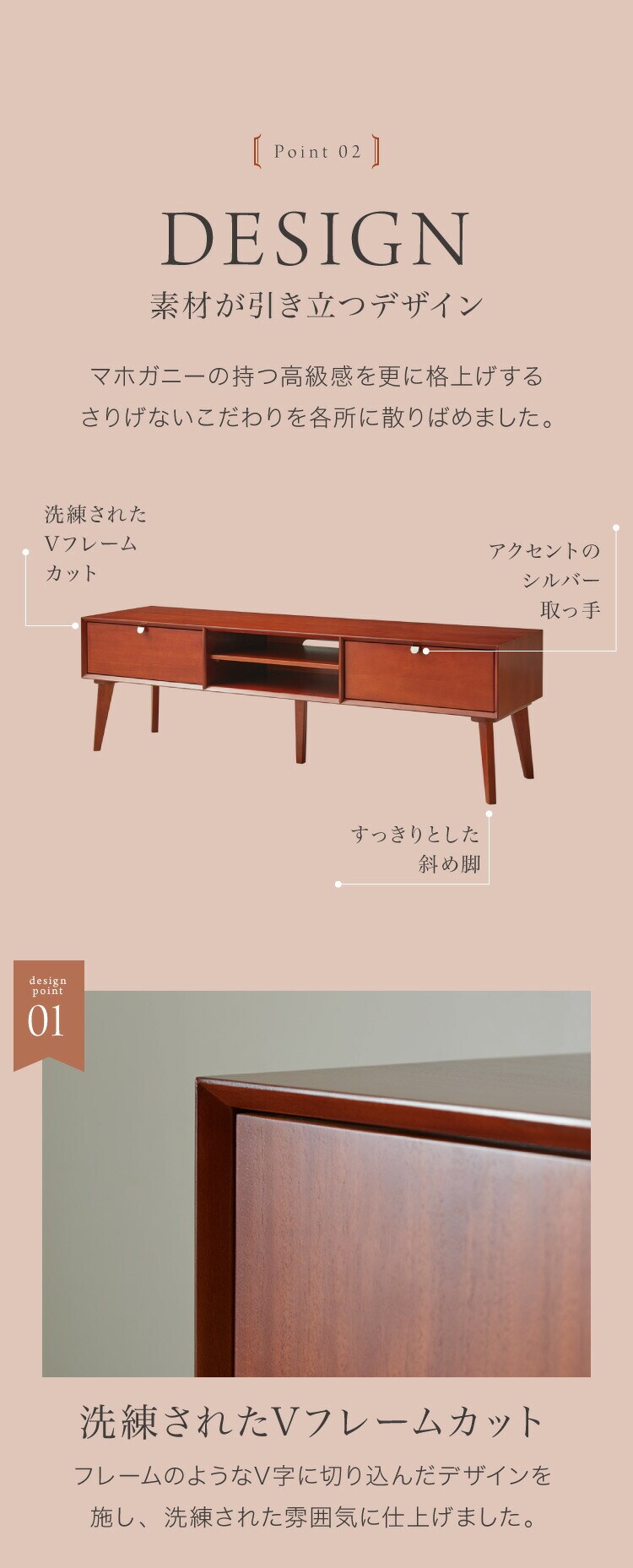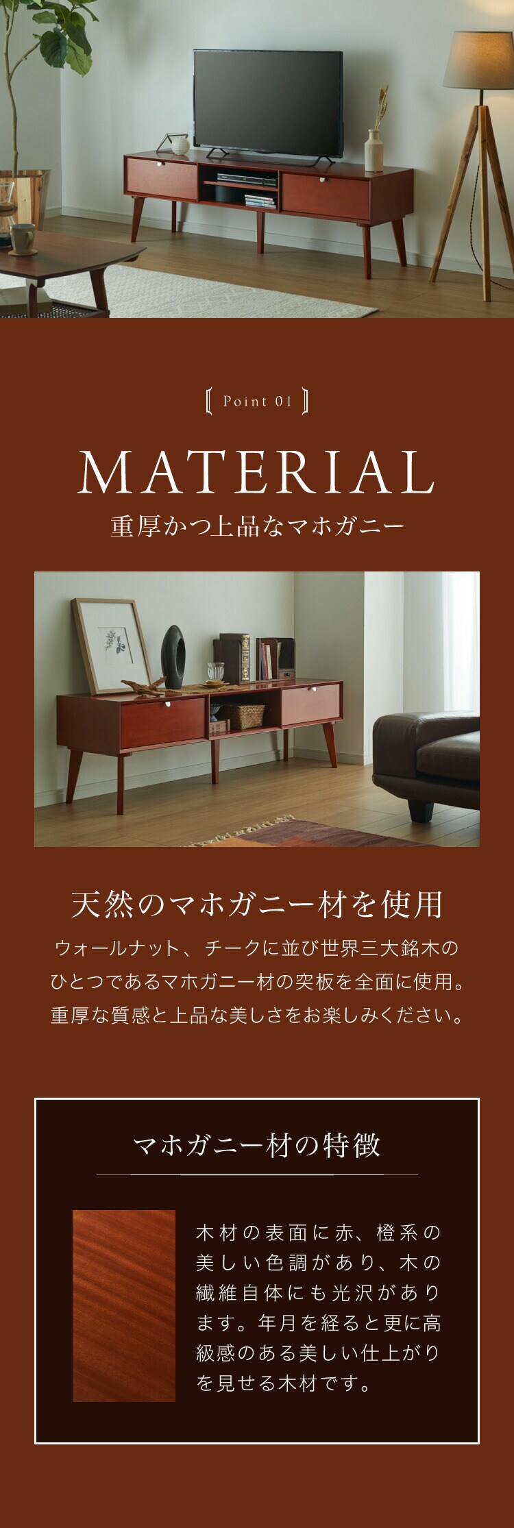 本ページは、そんなマホガニーの突板を背面や裏側に至るまでふんだんに使用したテレビ台の販売ページです。