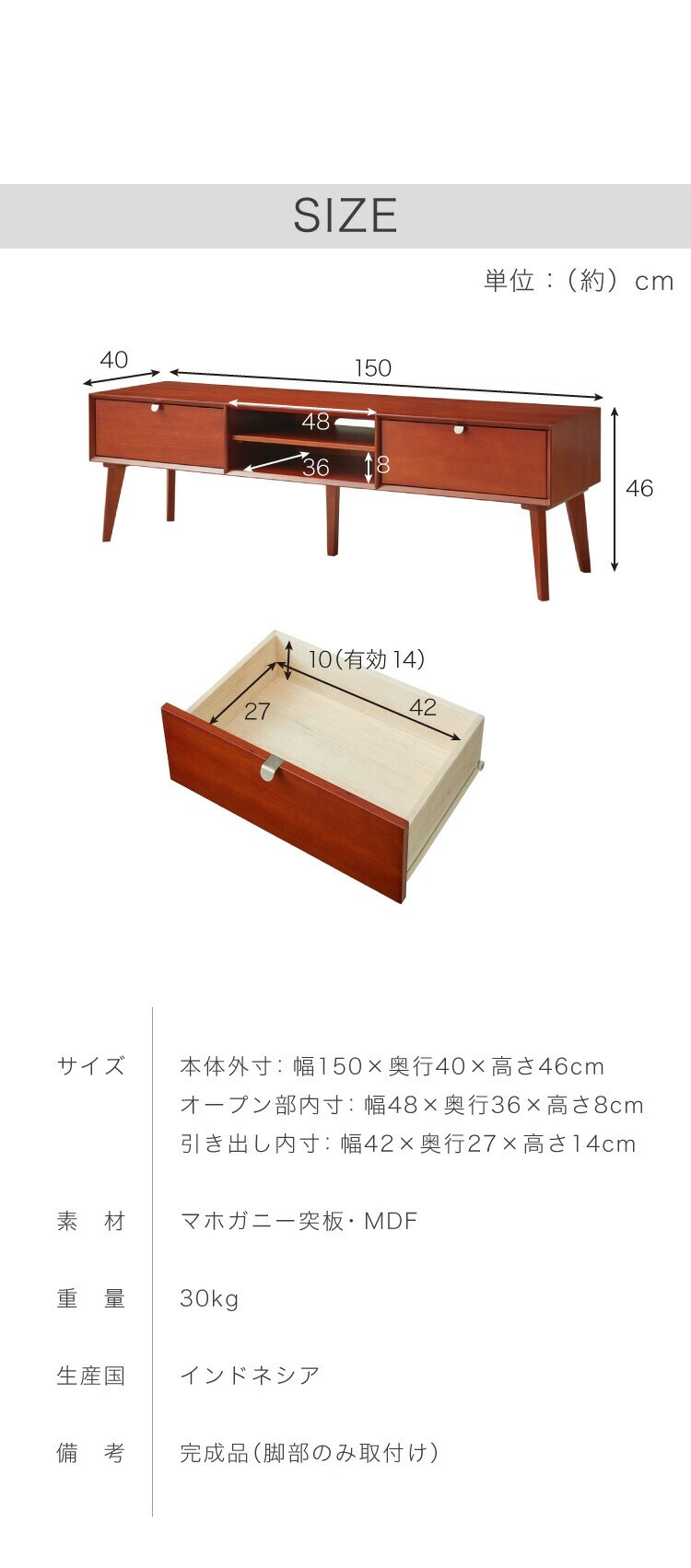 テレビ台 幅150cm 北欧 ヴィンテージ マホガニー材 完成品 収納家具 スライドレール式 コンパクト テレビボード テレビラック TV台 おしゃれ お洒落 モダン 高級感 木製 突板 収納 棚 AVA アヴァ【送料無料】のレビュー