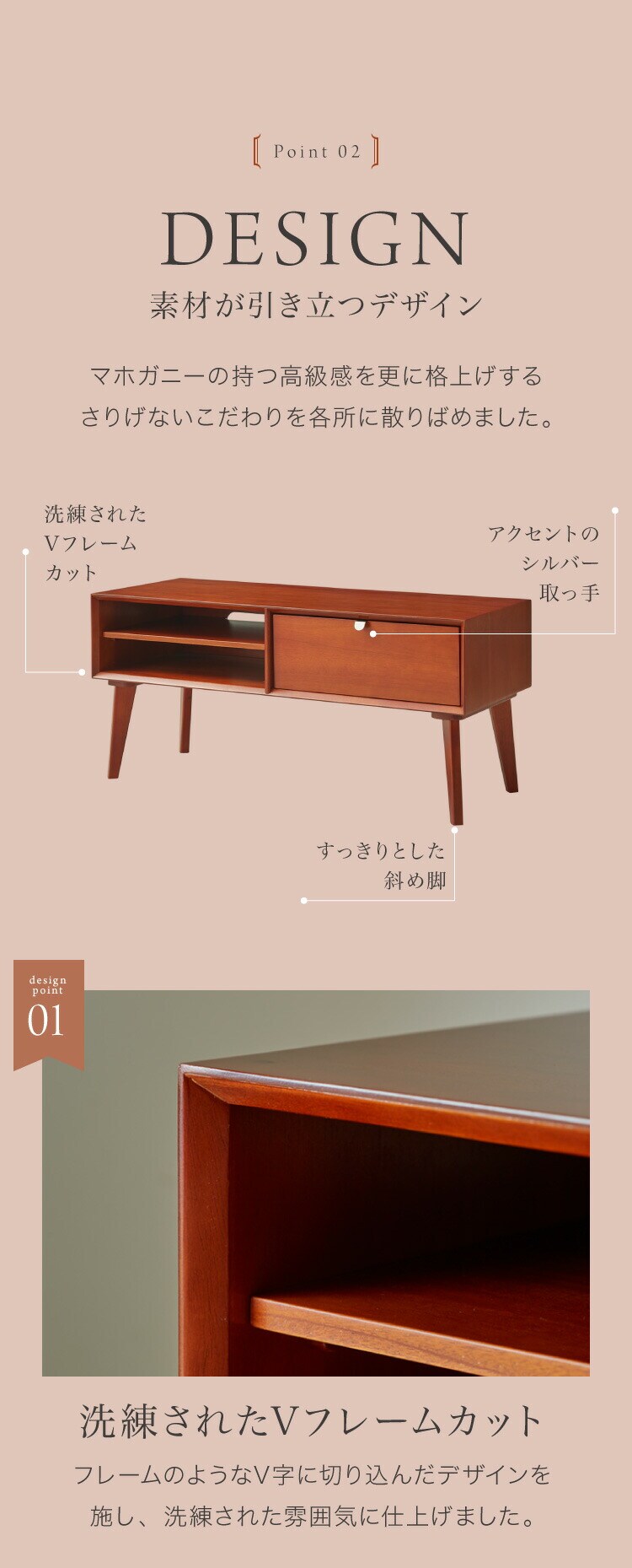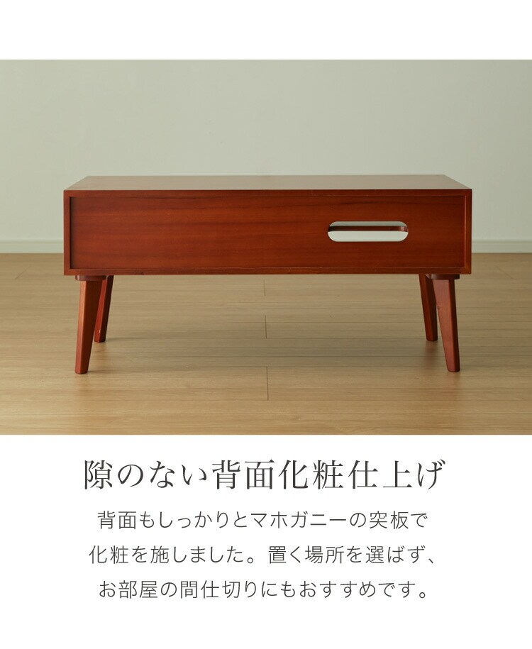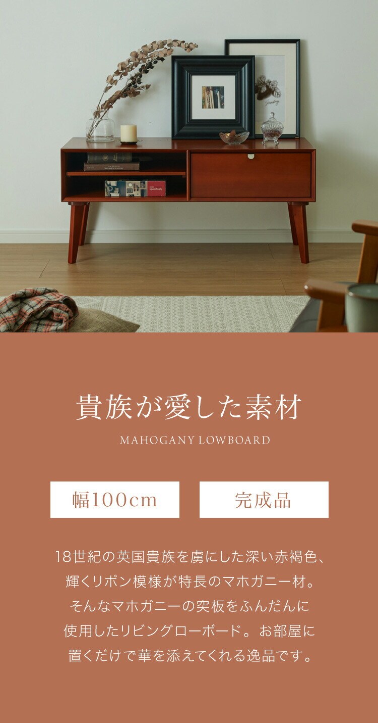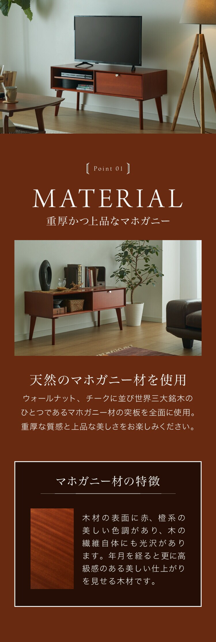 本ページは、そんなマホガニーの突板を背面や裏側に至るまでふんだんに使用したテレビ台の販売ページです。