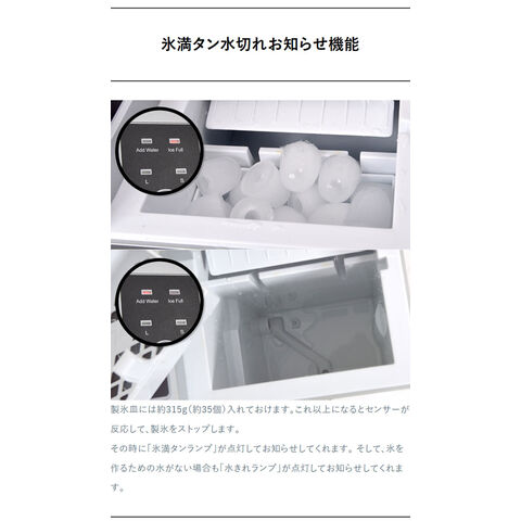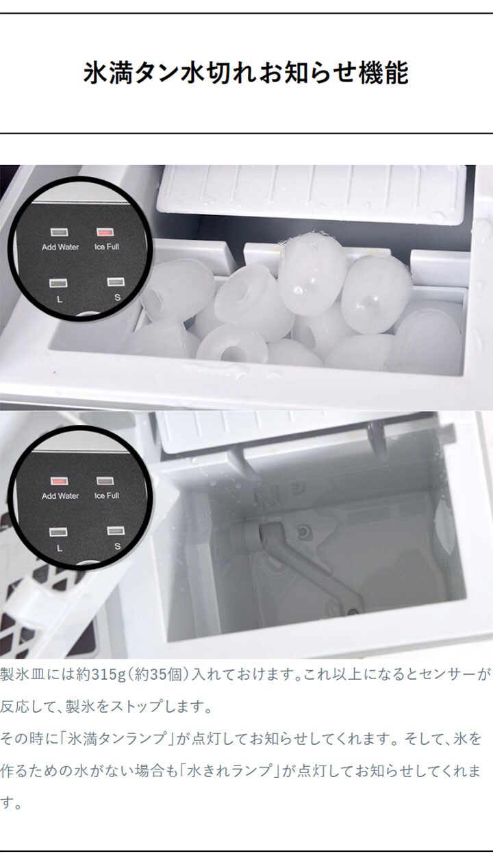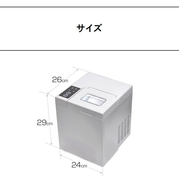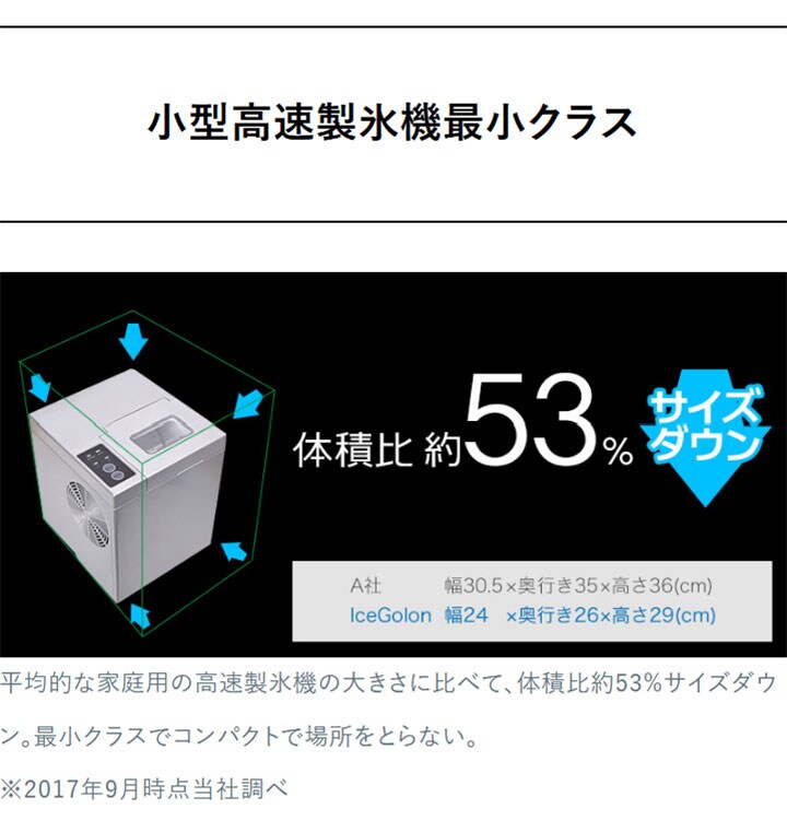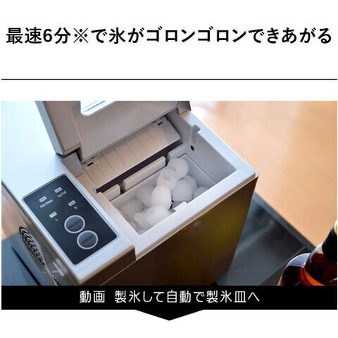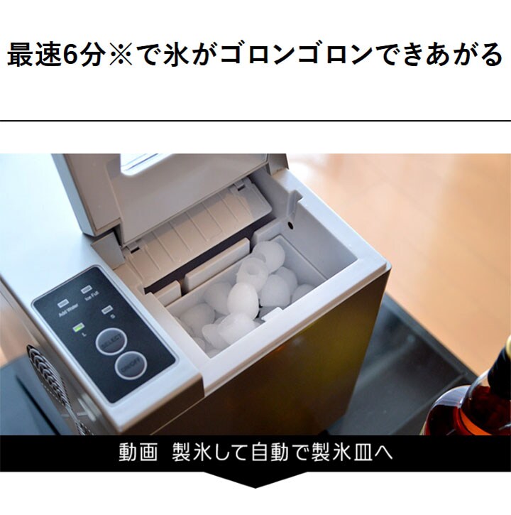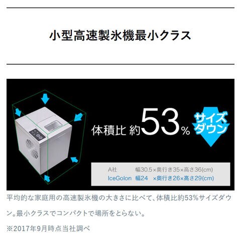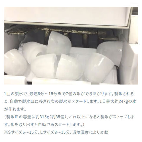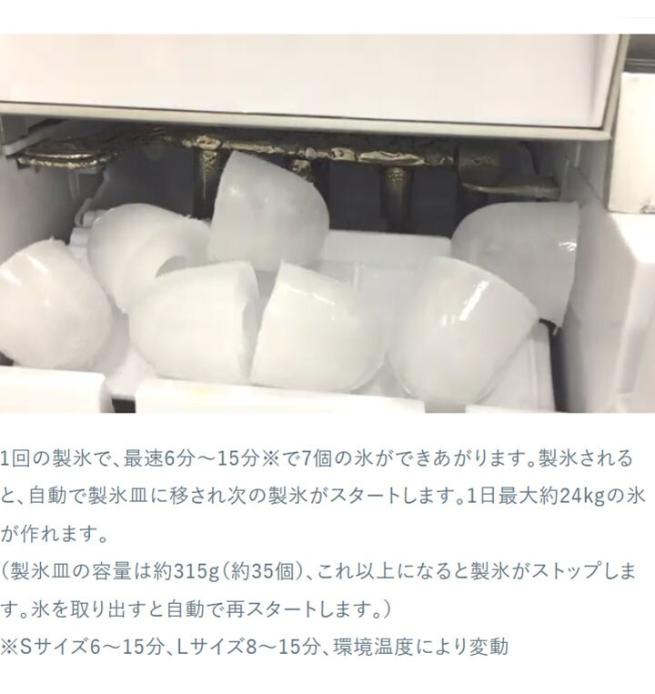 ●製氷能力:1回で製氷できる個数=7個、1回の製氷時間=最速6分~15分(氷Sサイズ6分、Lサイズ8分※環境温度により変動)、1日約24kg製氷(目安)