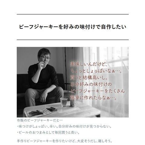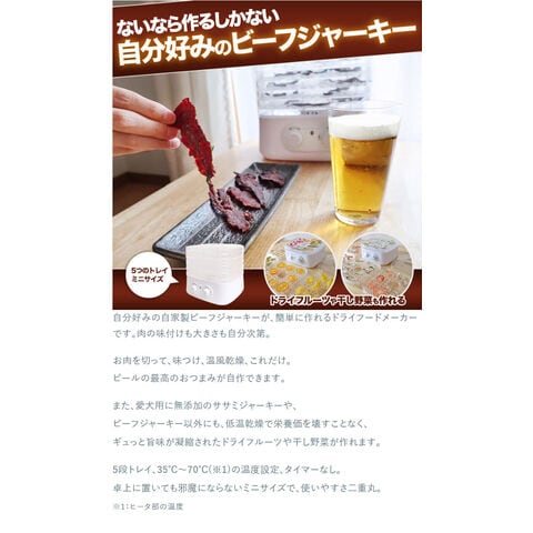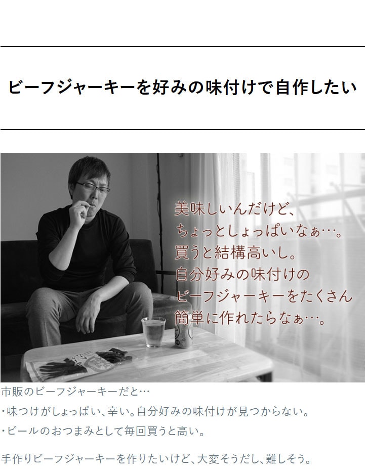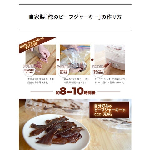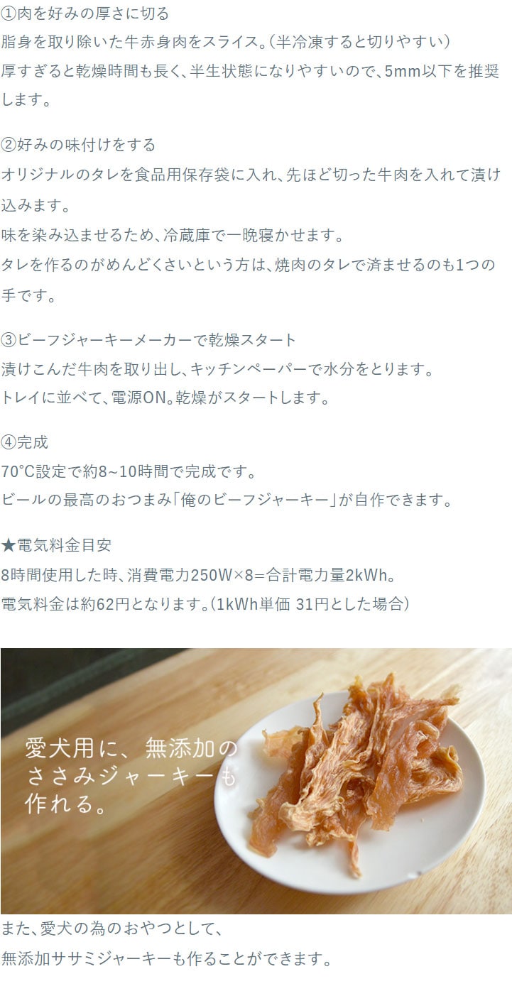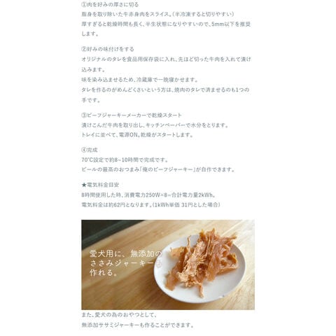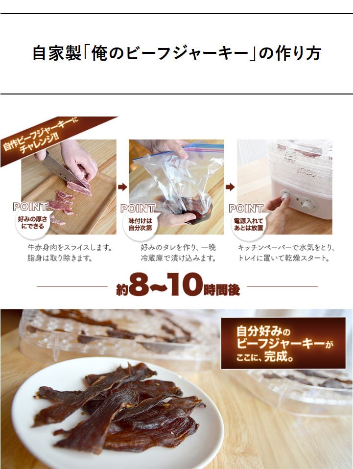 お肉を切って、味つけ、温風乾燥、これだけ。ビールの最高のおつまみが自作できます。