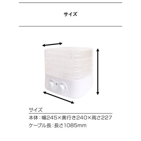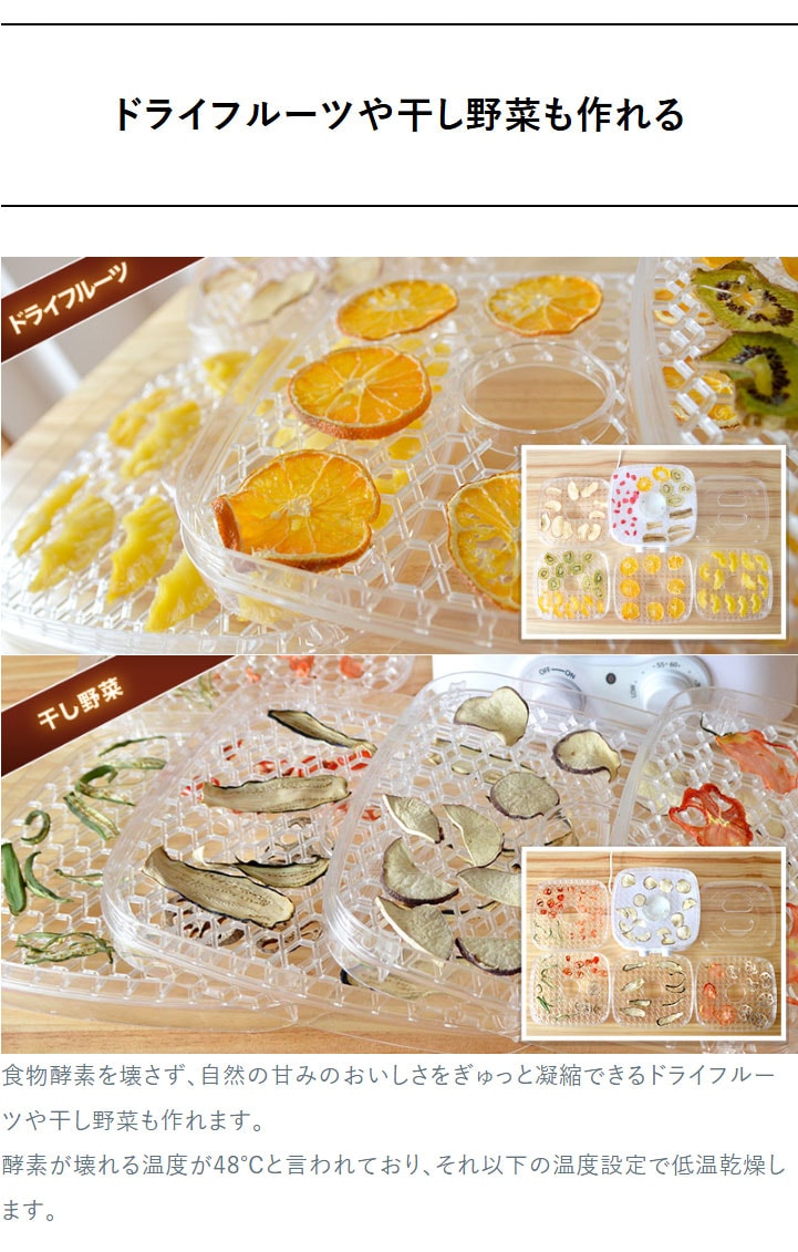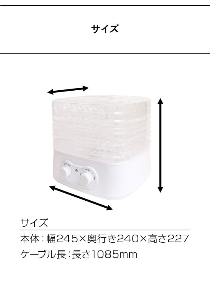 ★5段トレイ、35℃~70℃(※1)の温度設定、タイマーなし。※1:ヒータ部の温度
