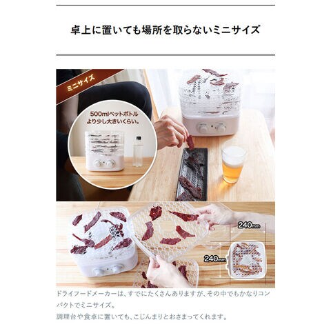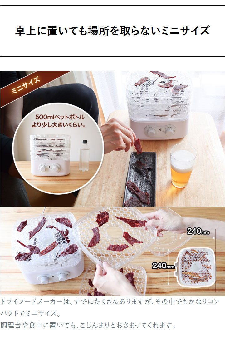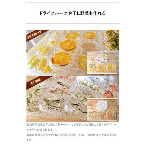 また、愛犬用に無添加のササミジャーキーや、ビーフジャーキー以外にも、低温乾燥で栄養価を壊すことなく、ギュっと旨味が凝縮されたドライフルーツや干し野菜が作れます。