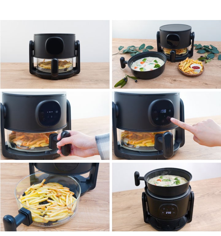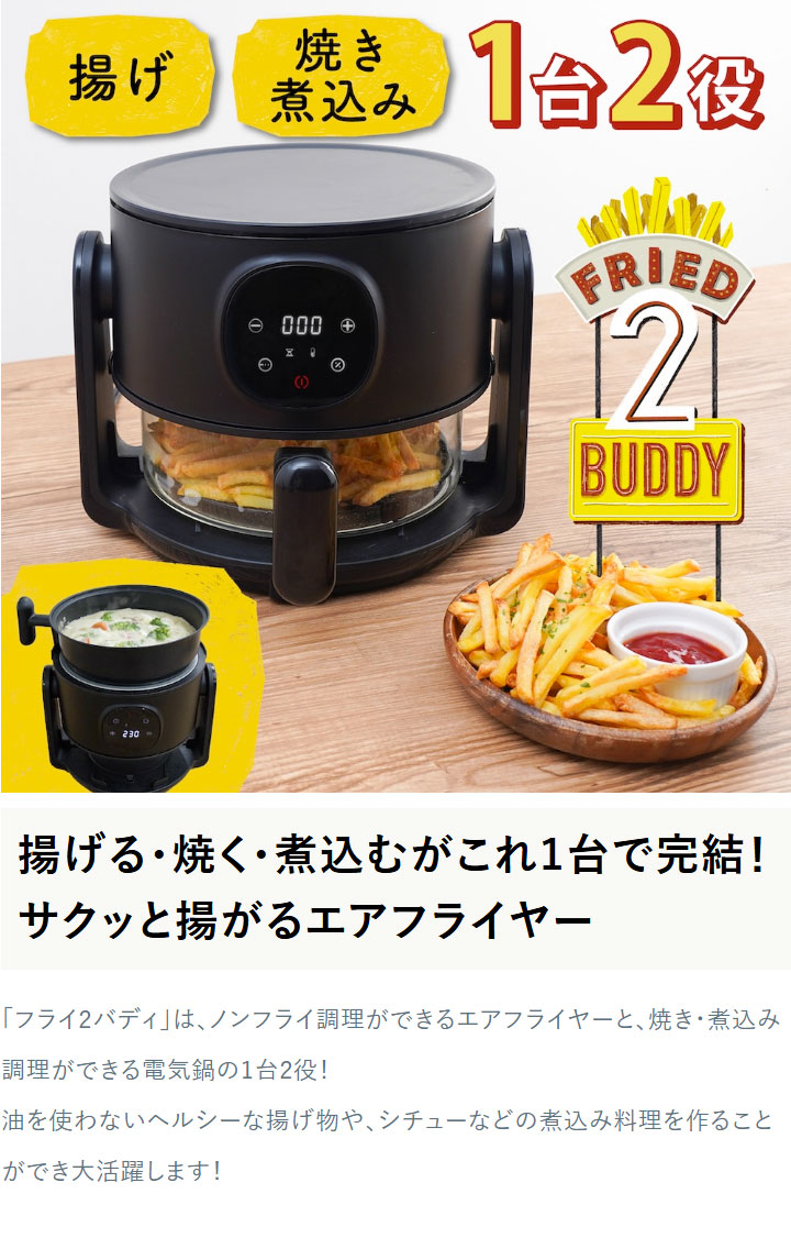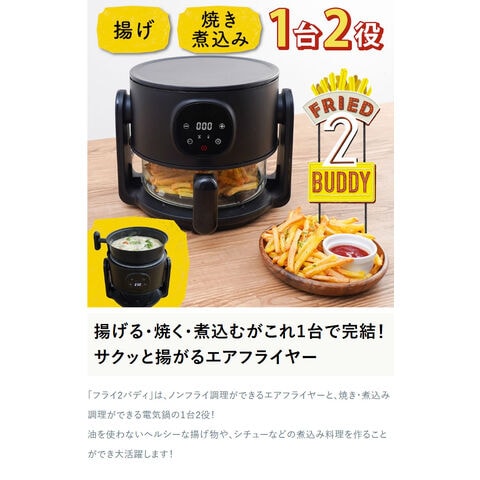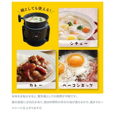 ノンフライ調理ができるエアフライヤーと、焼き・煮込み調理ができる電気鍋の1台2役!