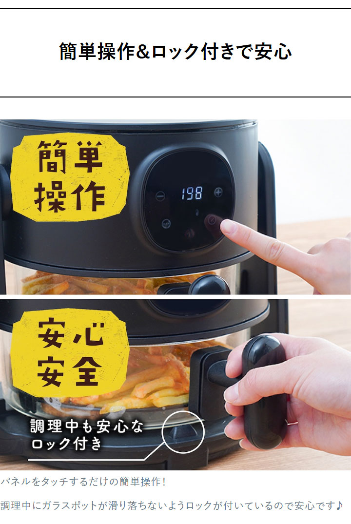 高さ控えめのガラスポットは、ムラなく均一に調理することが可能。食材を入れてほったらかしでOK!