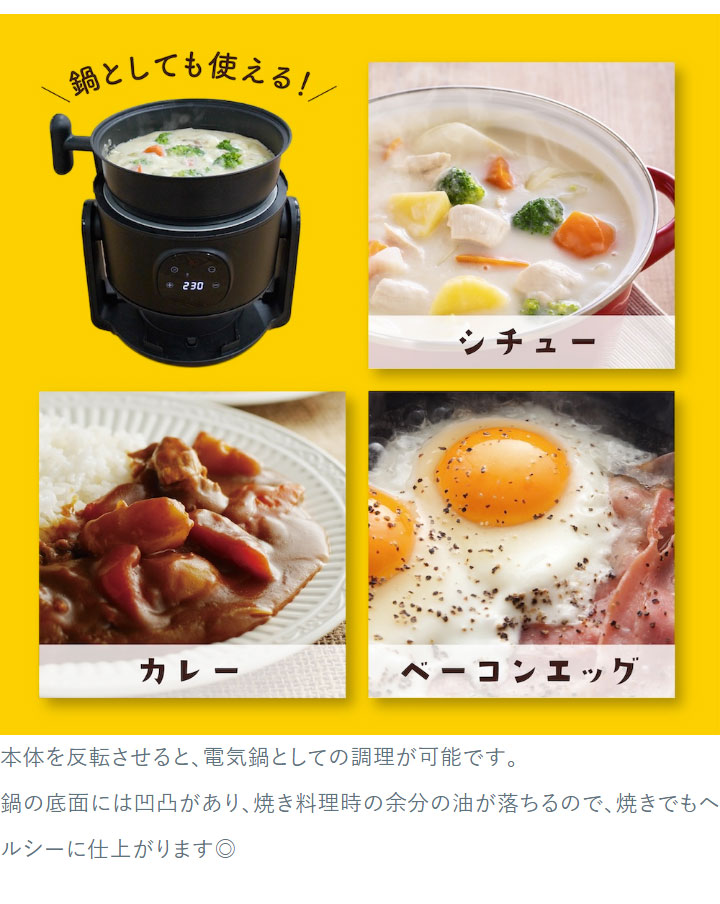 本体を反転させると、電気鍋としての調理が可能です。鍋の底面には凹凸があり、焼き料理時の余分の油が落ちるので、焼きでもヘルシーに仕上がります