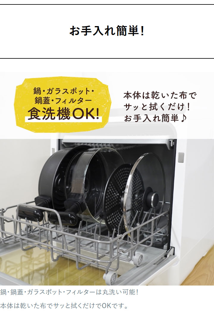 鍋・鍋蓋・ガラスポット・フィルターは丸洗い可能!食洗器も使用できます。