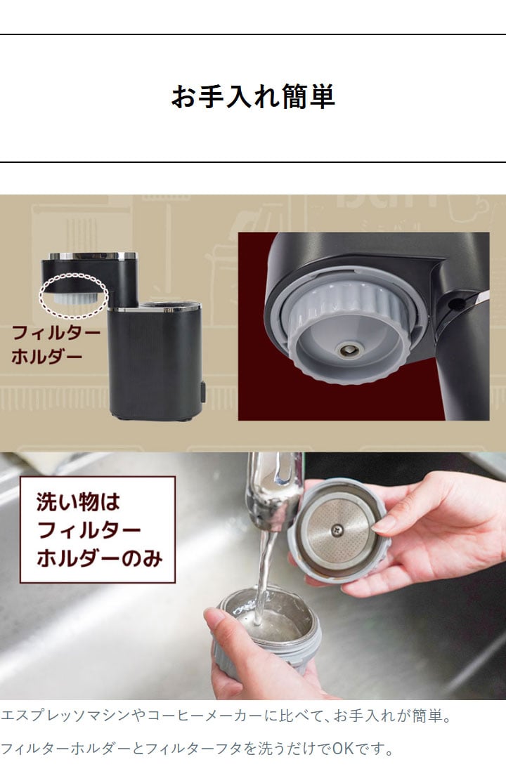 お手入れはフィルターホルダーとフィルターフタを洗うだけ。非常に簡単です。