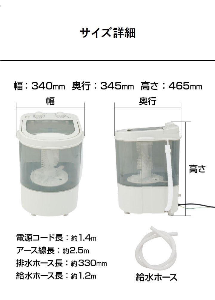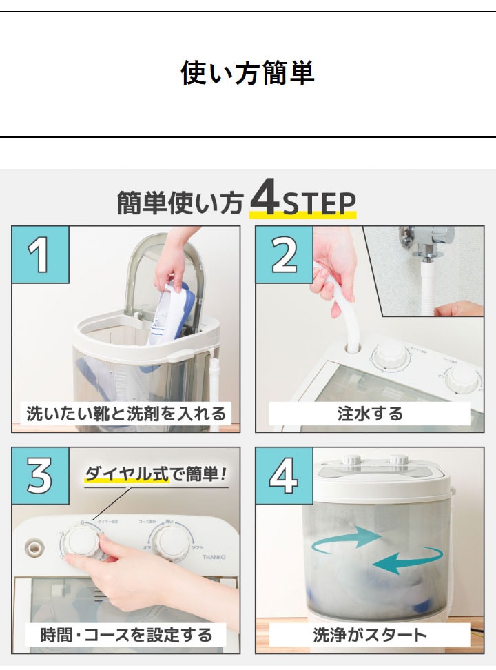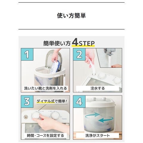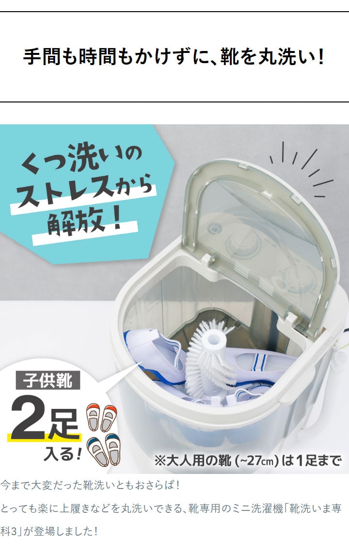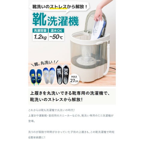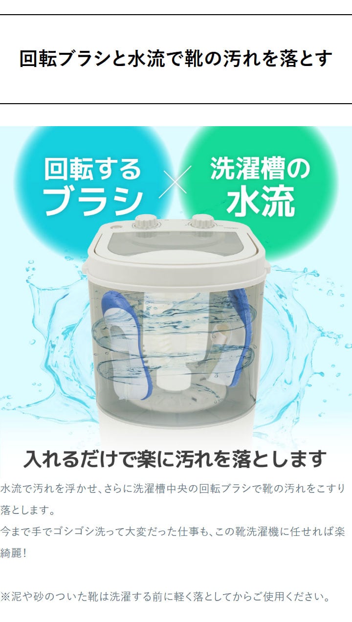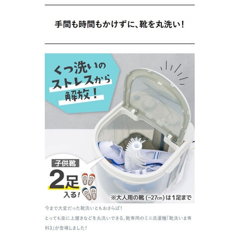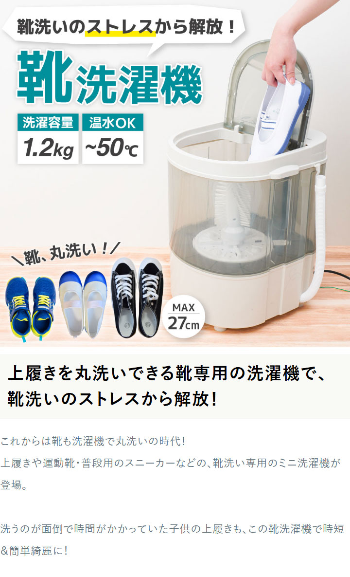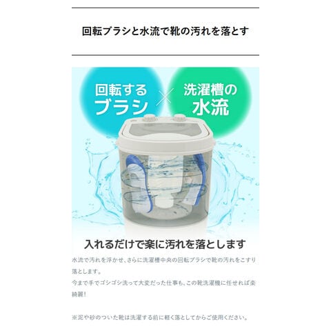 注意事項:※商品写真はできる限り実物の色に近づけるよう徹底しておりますが、お使いのモニター設定、お部屋の照明等により実際の商品と色味が異なる場合がございます。※記載されている物以外は付属いたしません。※洗濯槽に50度以上の水を注がないでください。※靴のサイズや形状によっては靴が引っかかったり一時的に回転が止まってしまう事がありますが、すぐに逆回転を始めて洗濯が再開されます。※水の量が多すぎると靴が蓋を押し上げてしまう事がありますので、その際は水の量を減らしてご利用ください。※本製品には脱水機能はございません。※その他マニュアルのご注意事項も必ずご注意ください。