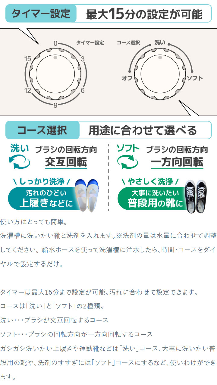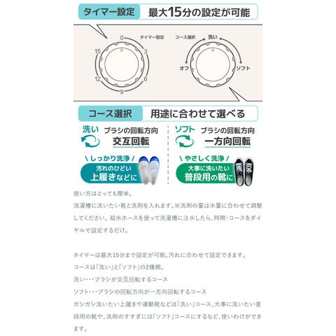 洗い・・・ブラシが交互回転するコースソフト・・・ブラシの回転方向が一方向回転するコースガシガシ洗いたい上履きや運動靴などは「洗い」コース、大事に洗いたい普段用の靴や、洗剤のすすぎには「ソフト」コースにするなど、使いわけができます。