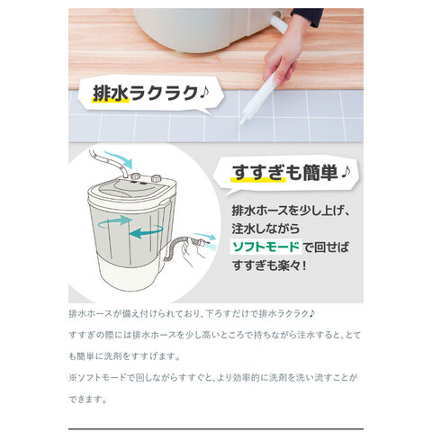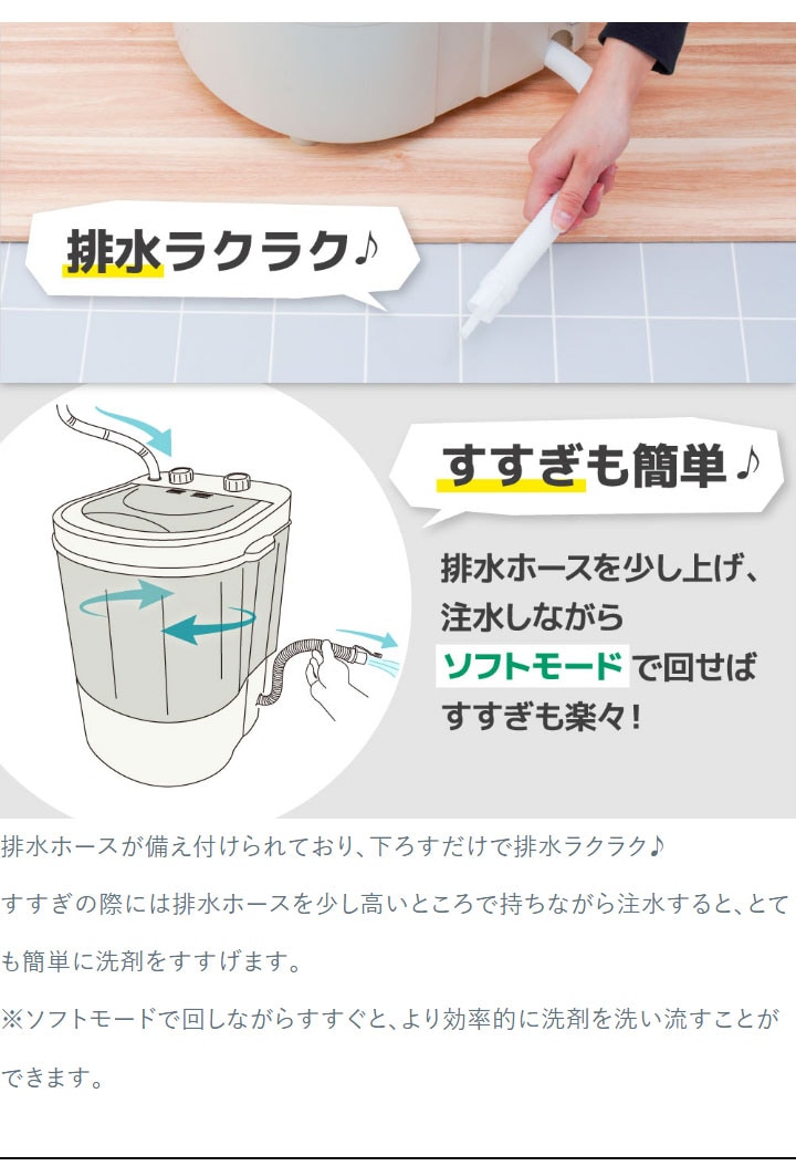 排水ホースが備え付けられており、下ろすだけで排水ラクラク♪すすぎの際には排水ホースを少し高いところで持ちながら注水すると、とても簡単に洗剤をすすげます。