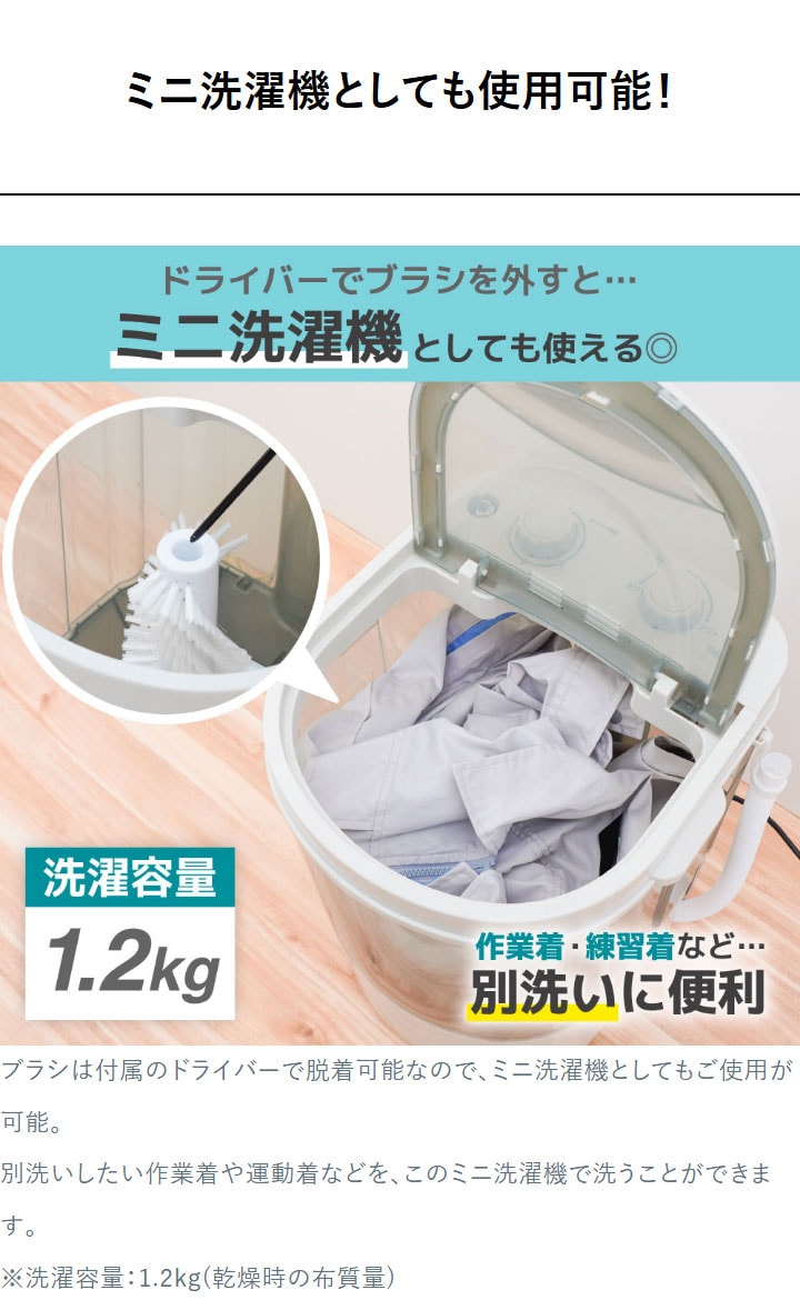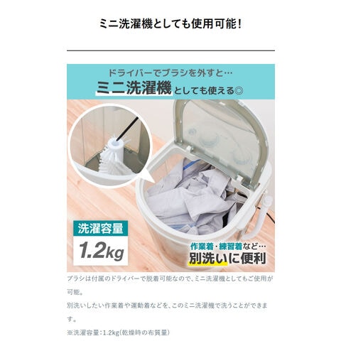 ブラシは付属のドライバーで脱着可能。ミニ洗濯機としても使用できます。
