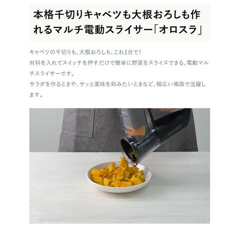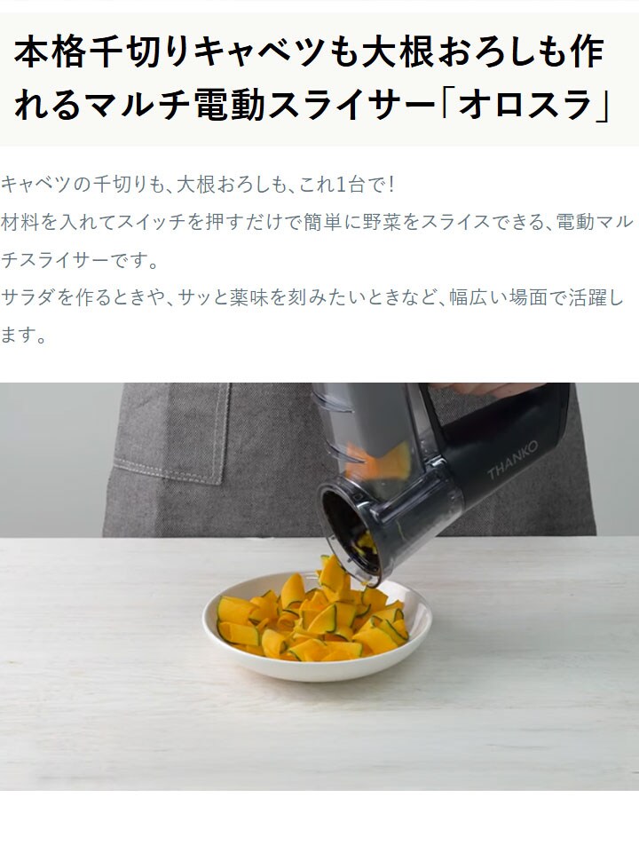 ●千切りキャベツも大根おろしも作れるマルチ電動スライサー「オロスラ」