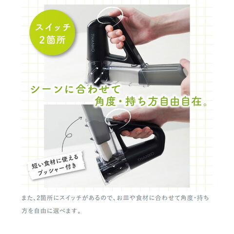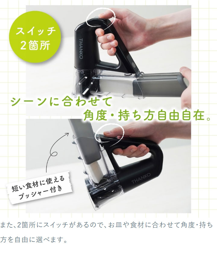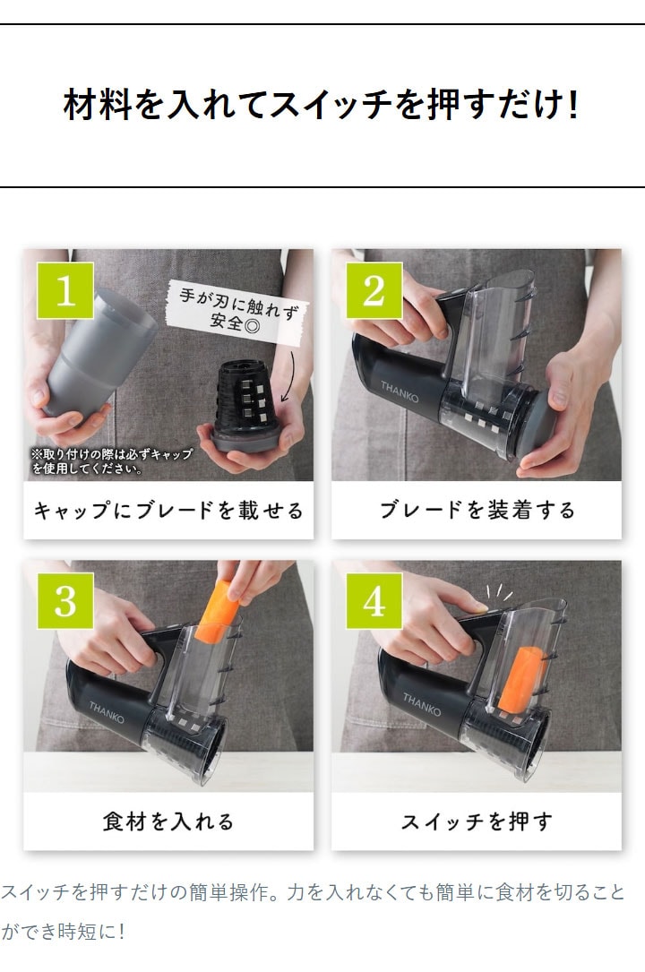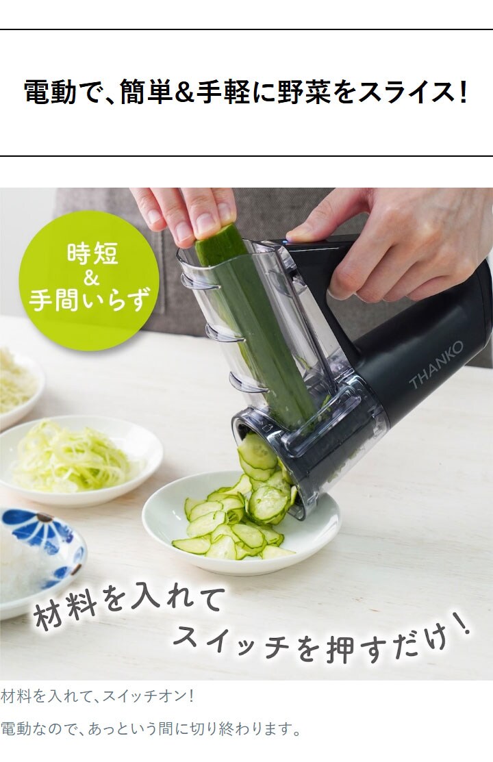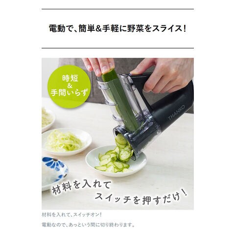 材料を入れてスイッチを押すだけで簡単に野菜をスライスできる、電動マルチスライサー。サラダを作るときや、サッと薬味を刻みたいときなど、幅広い場面で活躍します。