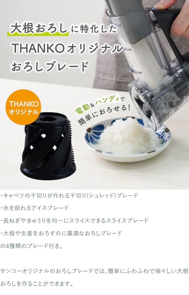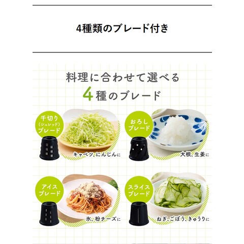 千切り、おろし、スライス、氷等、用途に合わせて選べるブレードがセット