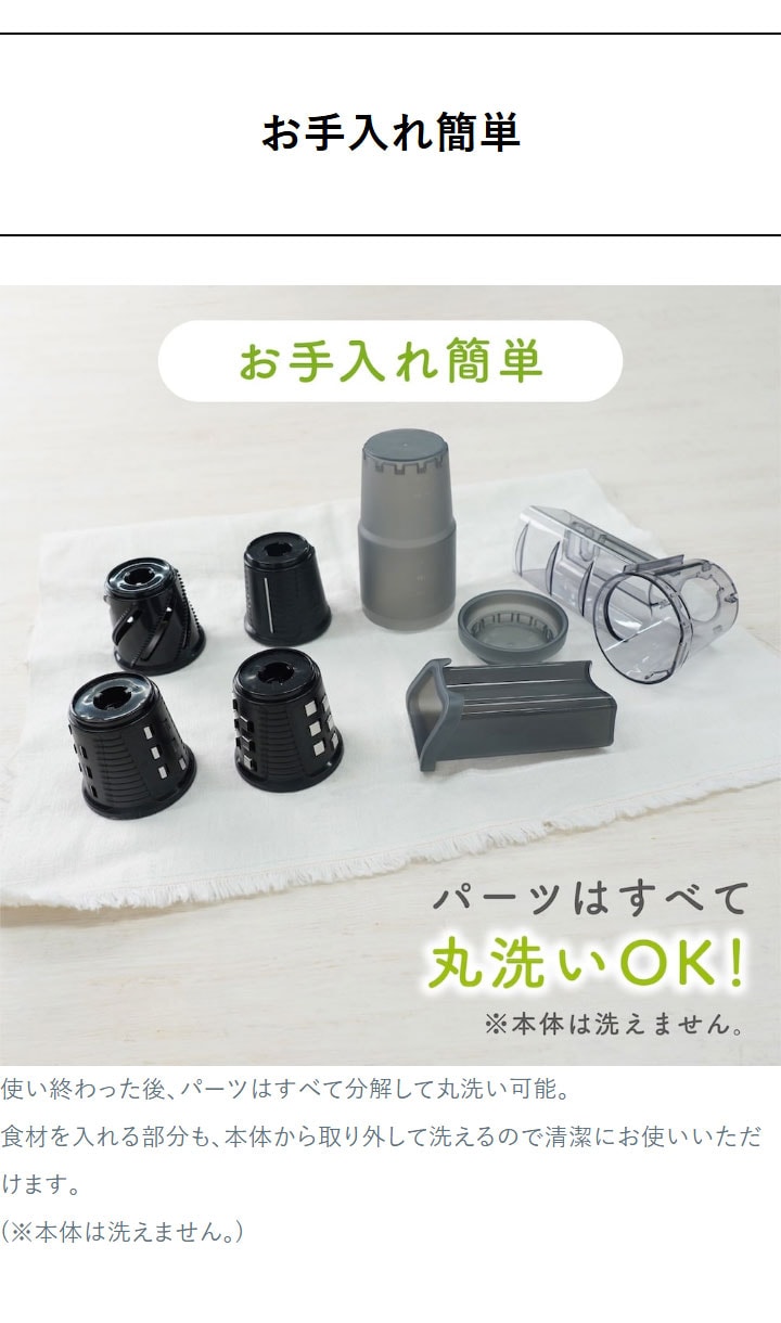 材質:本体:ABS+SUS304/スライサーカバー:AS/プッシャー:PP/ブレード4種共通:ABS+SUS420J2/収納計量カップ・キャップ:PP/お手入れ用ブラシ:PP+ナイロン