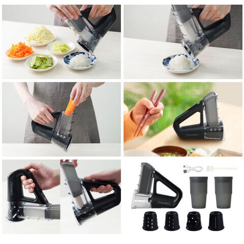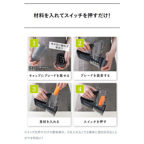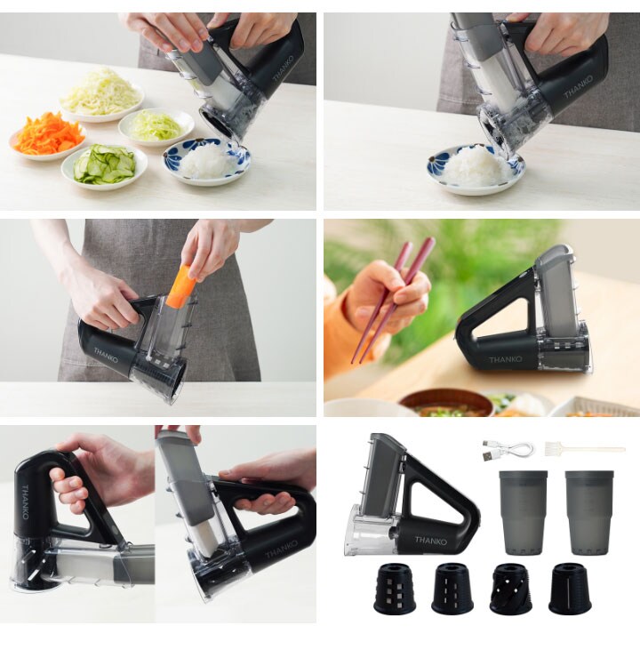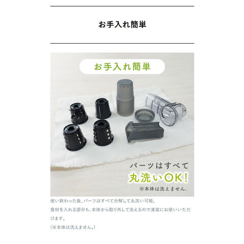 セット内容:本体/スライサーカバー/プッシャー/ブレード4種(スライス・おろし・シュレッド・アイス)/収納計量カップ・キャップ×2/USBType-C充電ケーブル/お手入れ用ブラシ/日本語取扱説明書