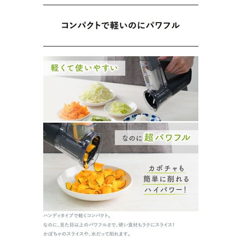 ハンディタイプで軽くコンパクト。なのに、見た目以上のパワフルさで、硬い食材もラクにスライス!かぼちゃのスライスや、氷だって削れます。