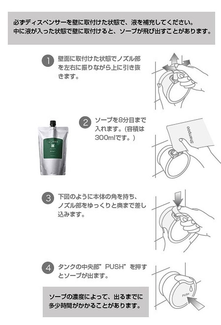 ディスペンサー、シャンプー、リンス、ボディーソープ、洗剤、洗面台、お風呂場、バス、詰替え容器、300ml、壁、壁面、落ちない、片手、押すだけ、ヌメリ、液だれしない、シンプル、吸盤