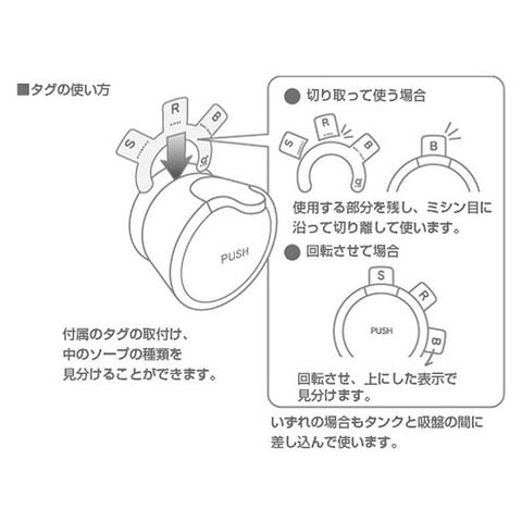 「S」シャンプー、「R」リンス、「B」ボディーソープの文字入り付属タグを使用すれば、 タンク内のソープの種類を見分けることができます。