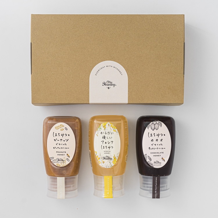 東京・表参道に本店を構える、はちみつ専門店MYHONEYのギフトセットです。贈り物に最適な3種(アカシア、チョコレート、ピーナッツ)のチューブボトルセット。甘さは生はちみつだけなので、ダイエット中の方や美容・健康を気にされている方に喜ばれる贈りものです。毎日の朝食やお料理に。