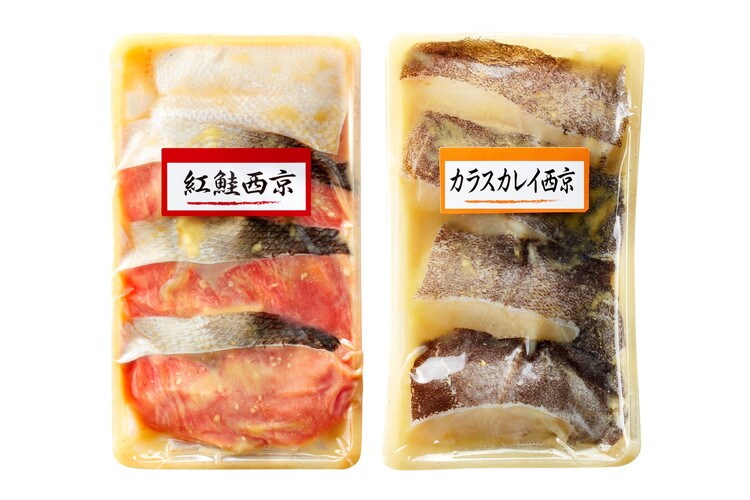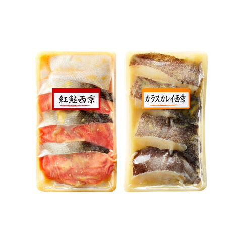 商品内容:カラスカレイ西京漬4切(計160g)、紅鮭西京漬4切(計160g)