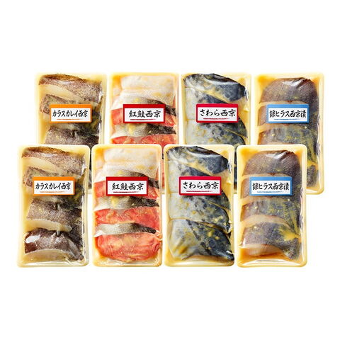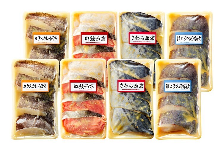 商品内容:カラスカレイ西京漬4切(計160g)、紅鮭西京漬4切(計160g)、さわら西京漬4切(計160g)、銀ヒラス西京漬4切(計160g)×各2