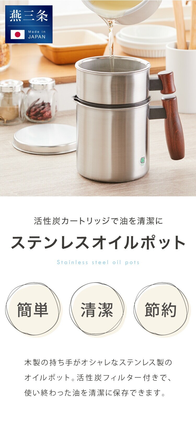日本製 燕三条 ステンレスオイルポット 800ml 木製ハンドル 活性炭カートリッジ 1個付き 油こし器 油入れ オイルポット ステンレス 注ぎ口付き おしゃれ【送料無料】