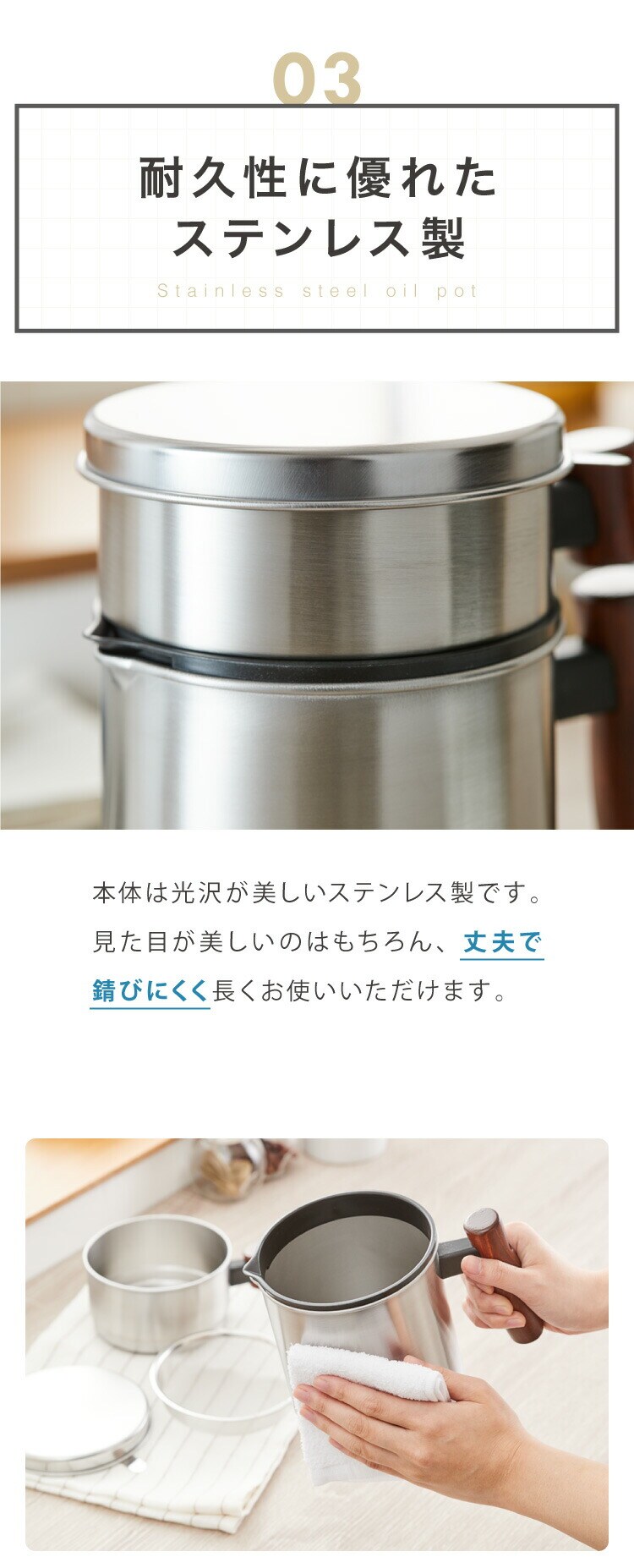 ■ステンレス×木製ハンドルのスタイリッシュなデザインのオイルポット。