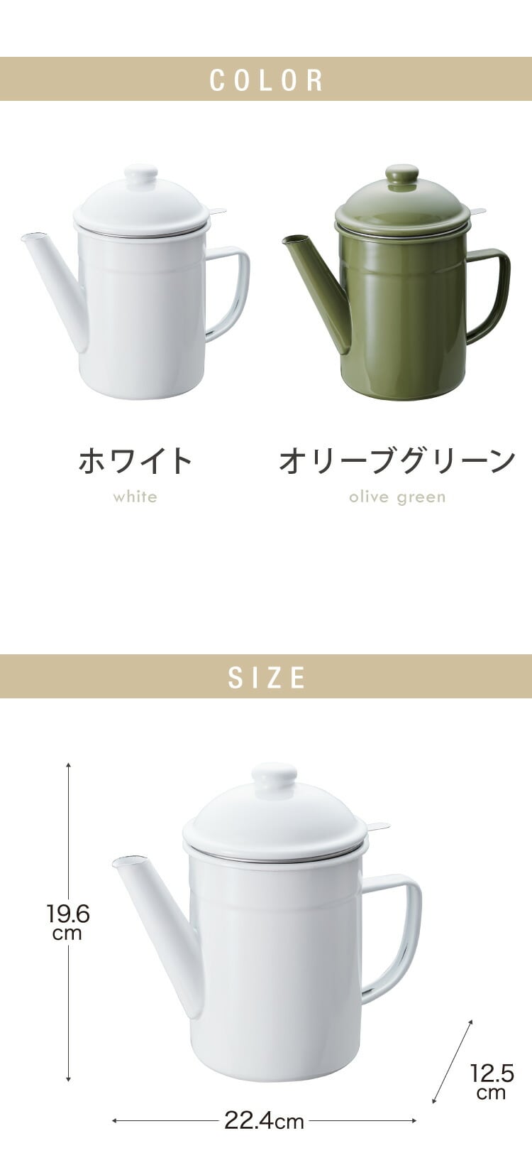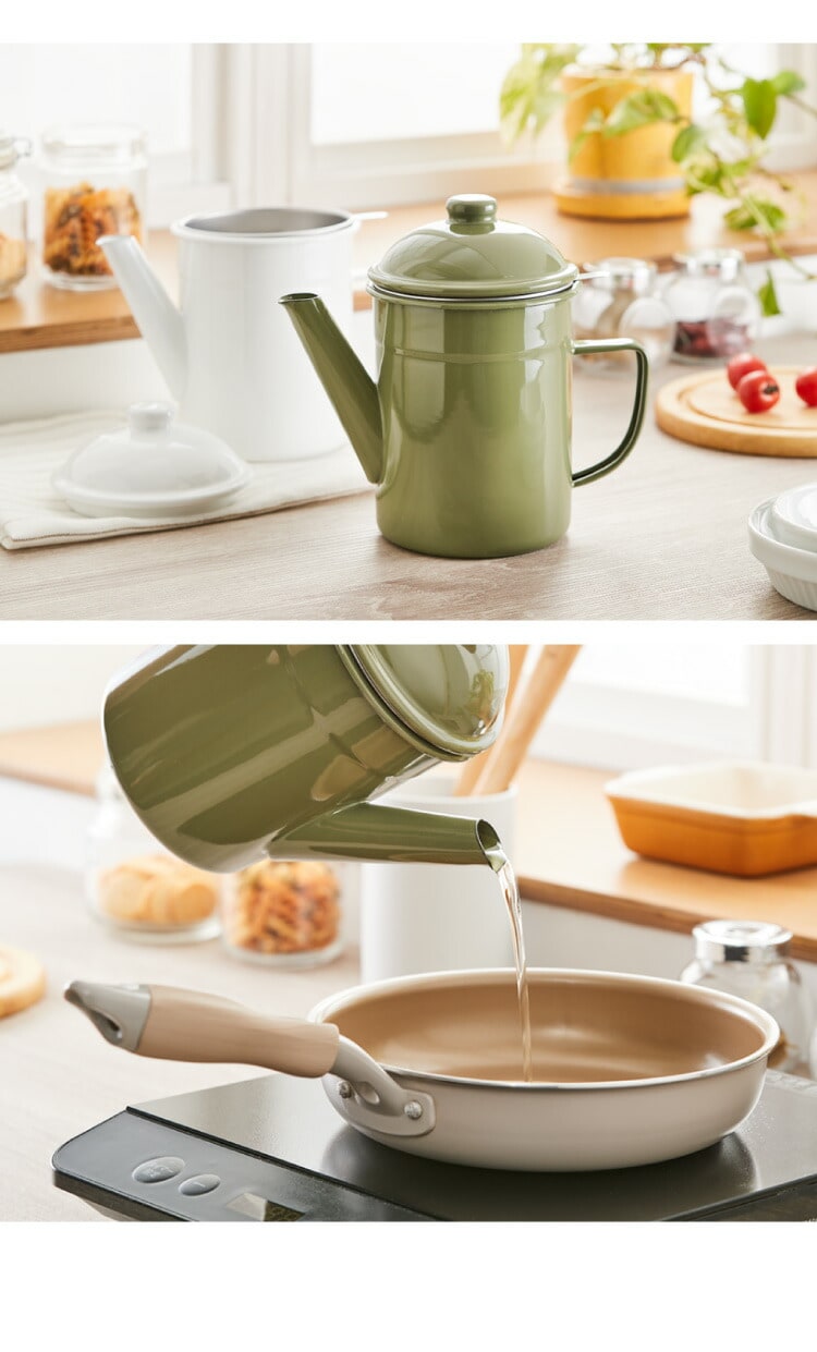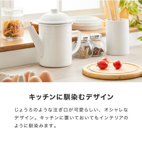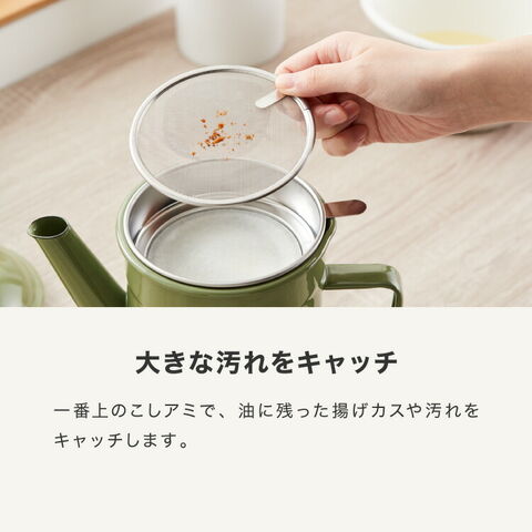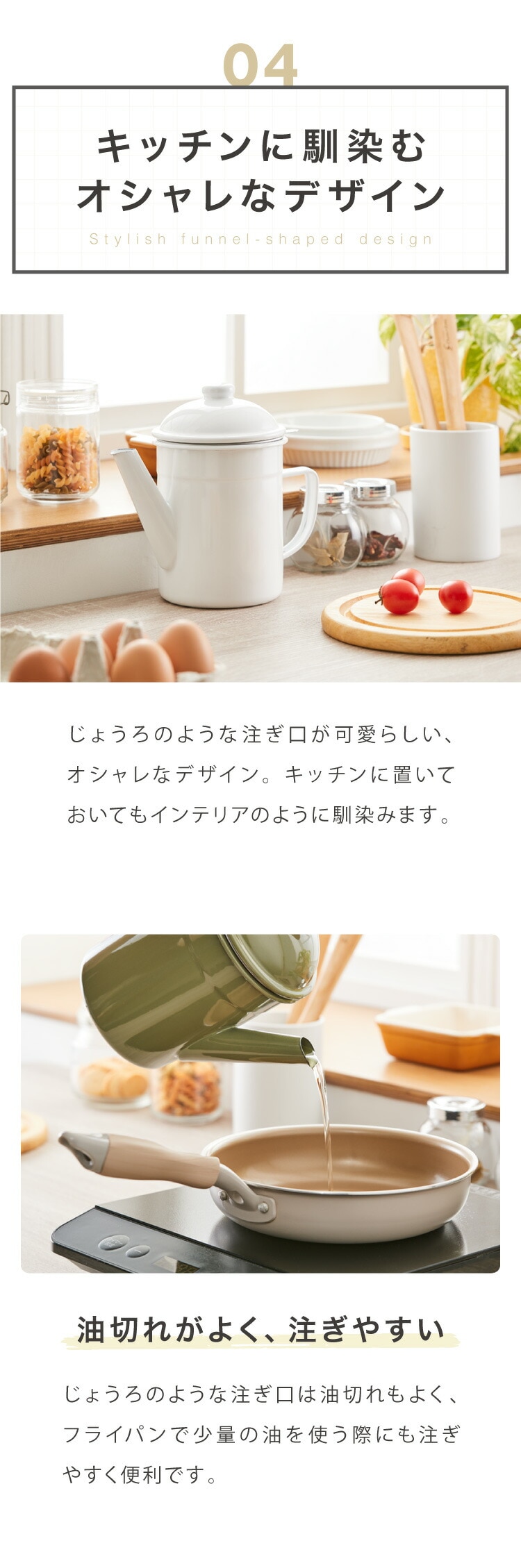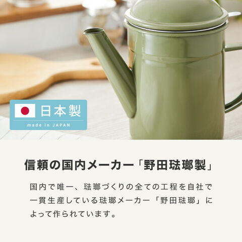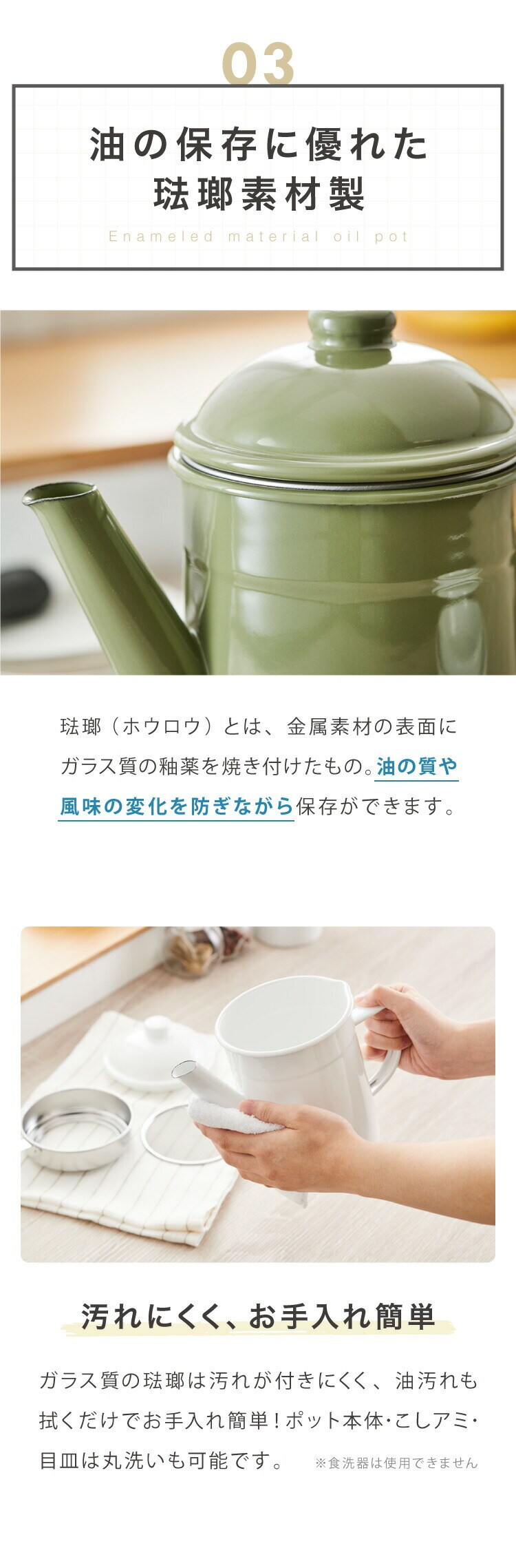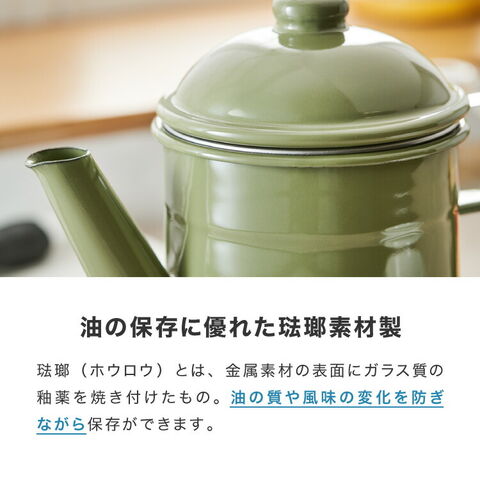 ■表面がガラス質の琺瑯は、油の質や風味の変化を防ぎながら保存でき、油汚れもキッチンペーパー等で拭くだけでお手入れしやすい、オイルポットに適した素材です。